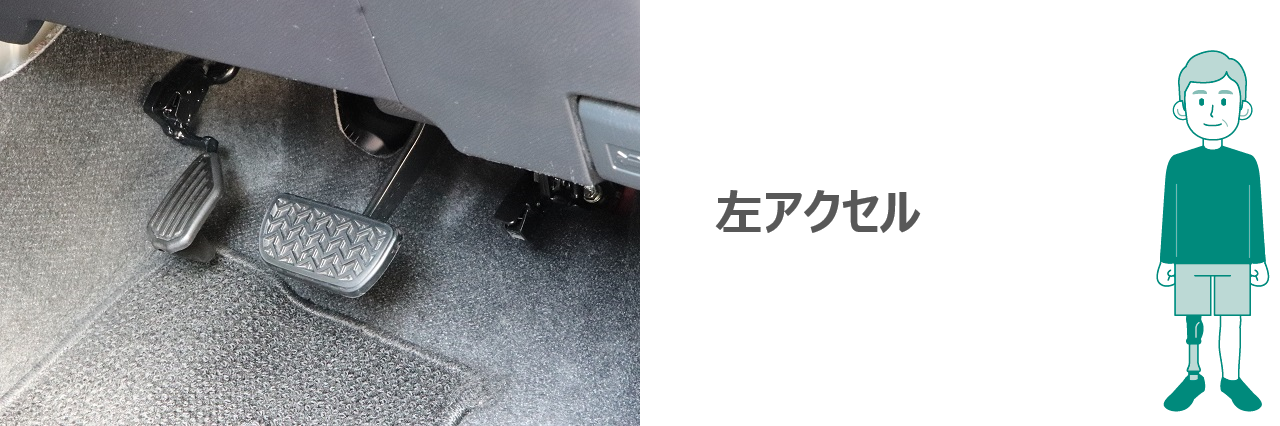 右足が不自由な方が、左足でアクセル操作ができる装置です。左アクセルはミクニライフ&オート(旧:ニッシン自動車工業)の吊下着脱式 左アクセルを採用。アクセルペダルを着脱可能にし、ペダルの付け替えで左右の切り替えが行えます。義足をご使用の方や関節を曲げにくい方に最適です。