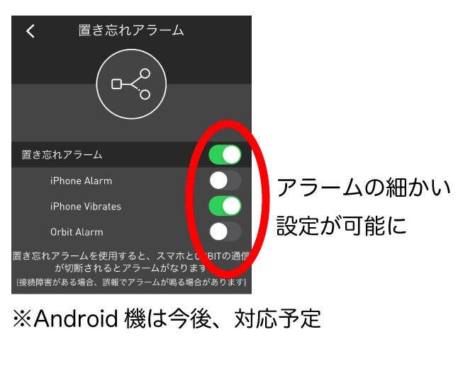 スマホのアラームのON/OFF、バイブのON/OFF、FINDORBIT側のアラームのON/OFFがそれぞれで設定できる様になりました。