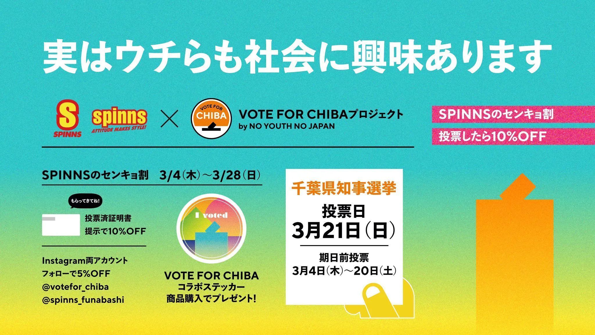 SPINNSららぽーとTOKYO-BAY店にて選挙割を実施、お買い物いただいたお客様にはオリジナルVOTED (投票済)ステッカーの配布や、店内での「わたしの生きたい社会」ボードの設置などを行わせていただきました。