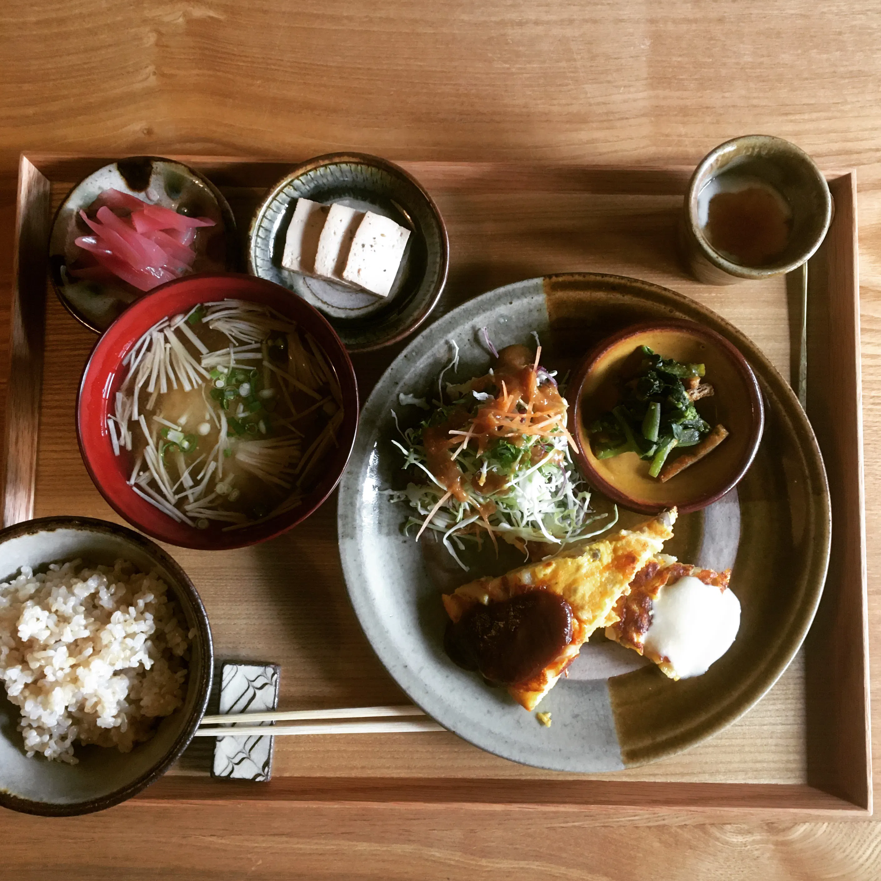 お味噌汁のお味噌は月替わりの米味噌、定番の麦味噌、豆味噌の3種類の中からお選び頂くことが出来て、ご注文毎にお味噌を溶いてお出ししています。ご注文の際に丁寧にお味噌のご説明をすることを通して、お味噌の地域性・多様性・伝統性についてもお伝えしていてお客様同士でご家庭のお味噌について語り合う姿が店内でよく見られます。