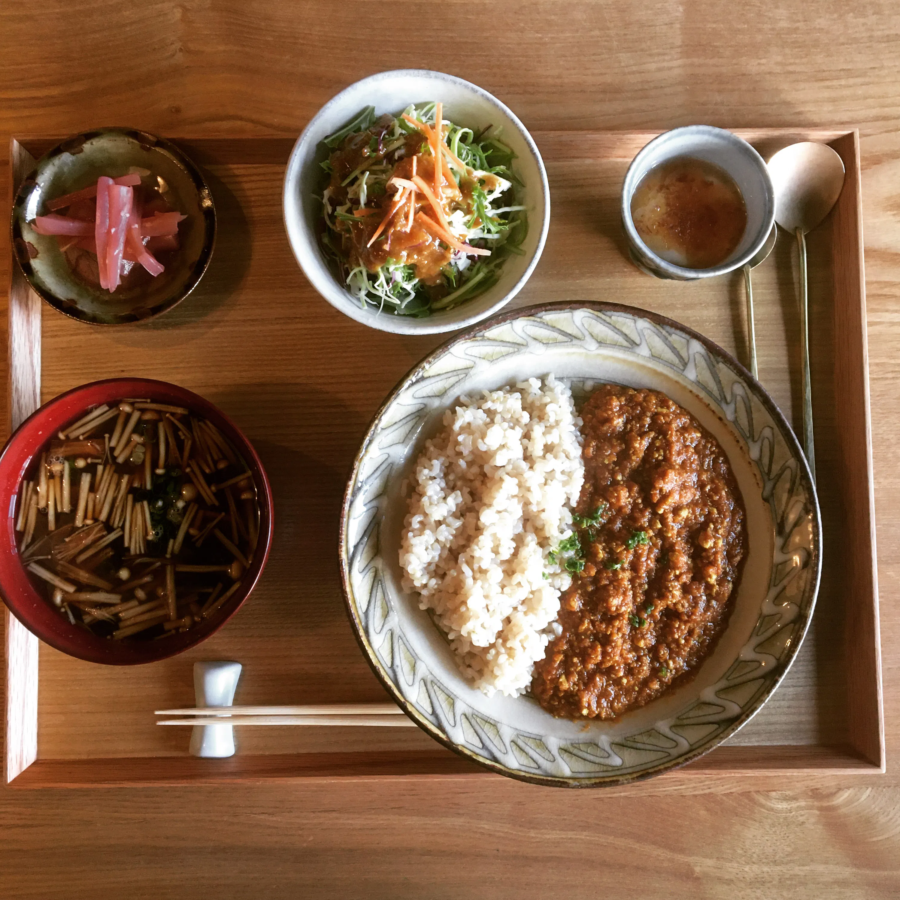 こちらのセットお味噌汁のお味噌を選べて、発酵食品たっぷりです。さらに味噌キーマカレーは、チーズ、キムチ、納豆、ヨーグルト味噌漬けの卵のトッピングも選べて発酵食品同士のマリアージュをお楽しみ頂けます。