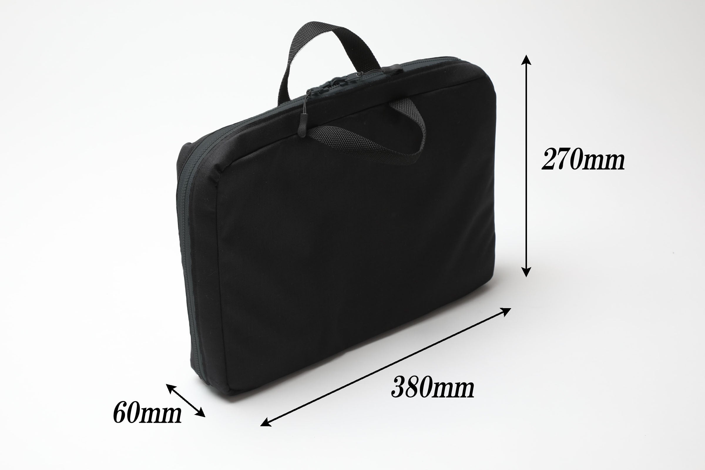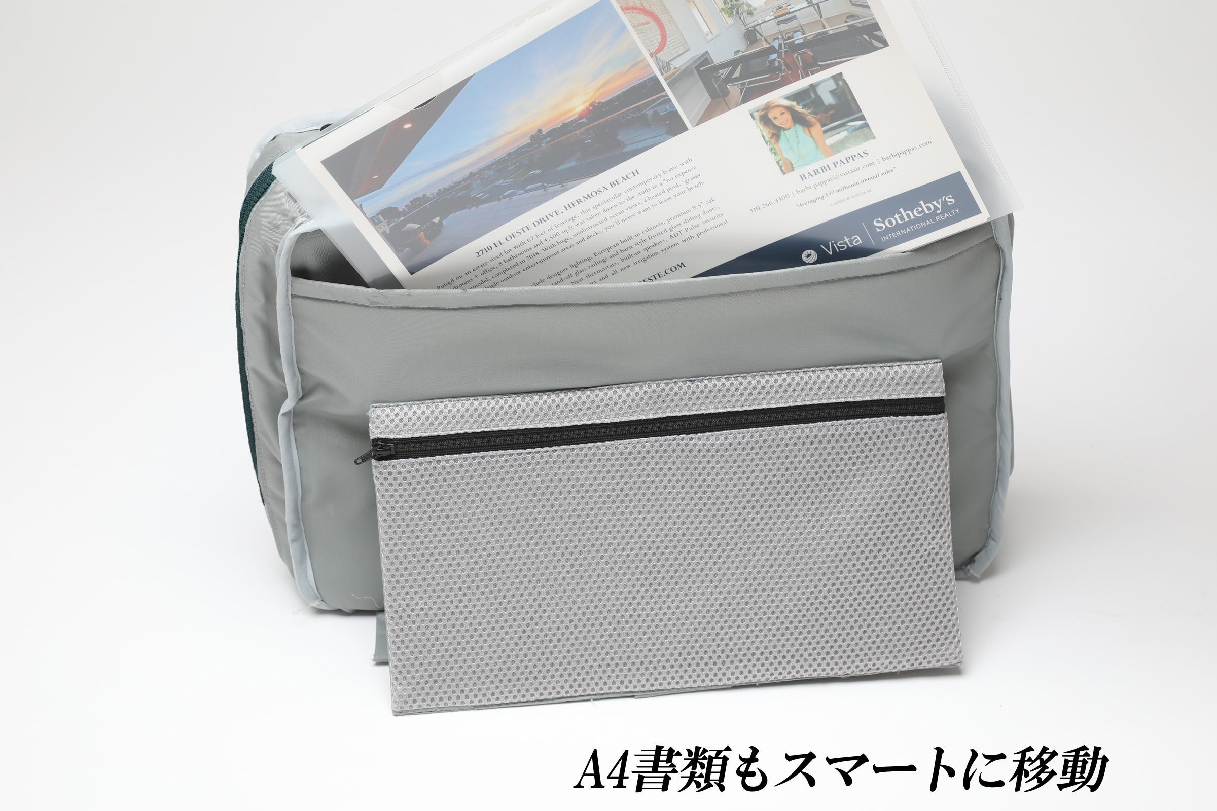 A4書類を入れたクリアフォルダが曲げずに入る内側大ポケットを配置しました。