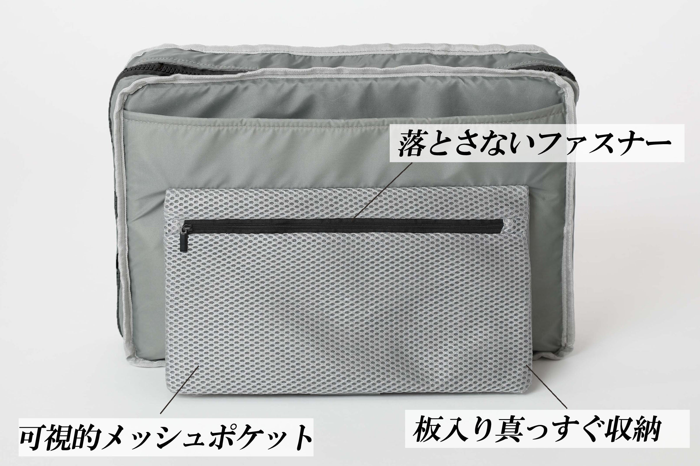 メッシュポケットは、網なので中身が確認しやすく、ファスナー付きなので大切なものを落とす心配がありません。また、板入りなので、チケット、搭乗券、パスポート、払込取扱票など、折り曲げたくない大事なものを収納するのに便利です。