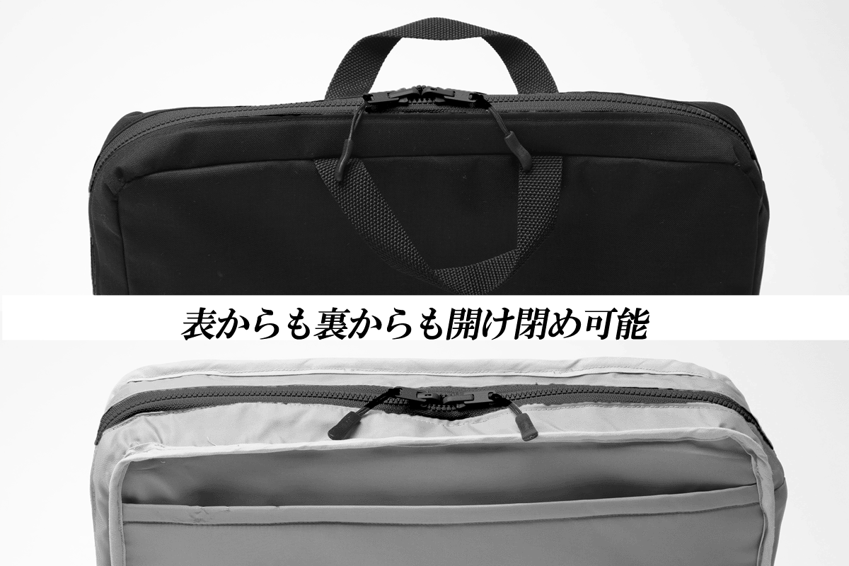 表からも裏からも使えるリバーシブルファスナーをダブルで採用。表裏左右どこからでもアクセスを容易にしました。