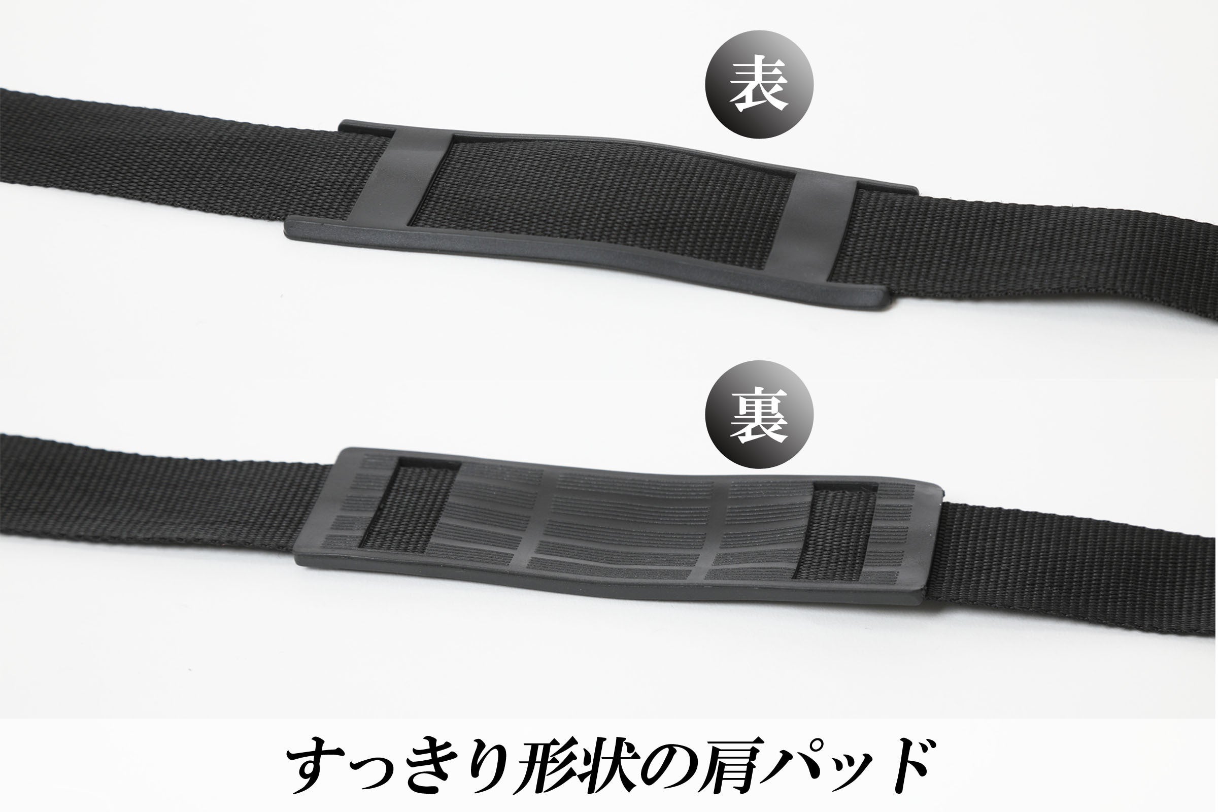 ショルダーベルトはゴム製の肩パット付きなので滑りにくく肩の負担を軽減します。ベルト幅に合わせた専用パッドなので見た目もスマートです