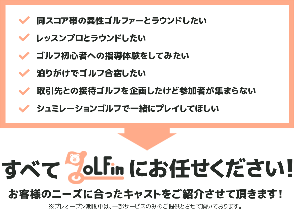 『9oLFin』は性別をなくした幅広いキャストのラインナップを重要視しております。一般的なコンパニオン派遣業とは違い、性別に関わらず、レッスンプロから初心者、容姿、年齢、スコアアベレージに至るまで、ご希望に沿ったお好みのキャストを選べます。