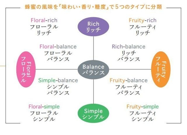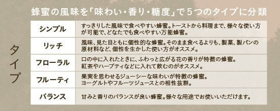 いろいろな花から採れる蜂蜜を「味わい・香り・糖度」により分類し、5つのタイプで表現しています。