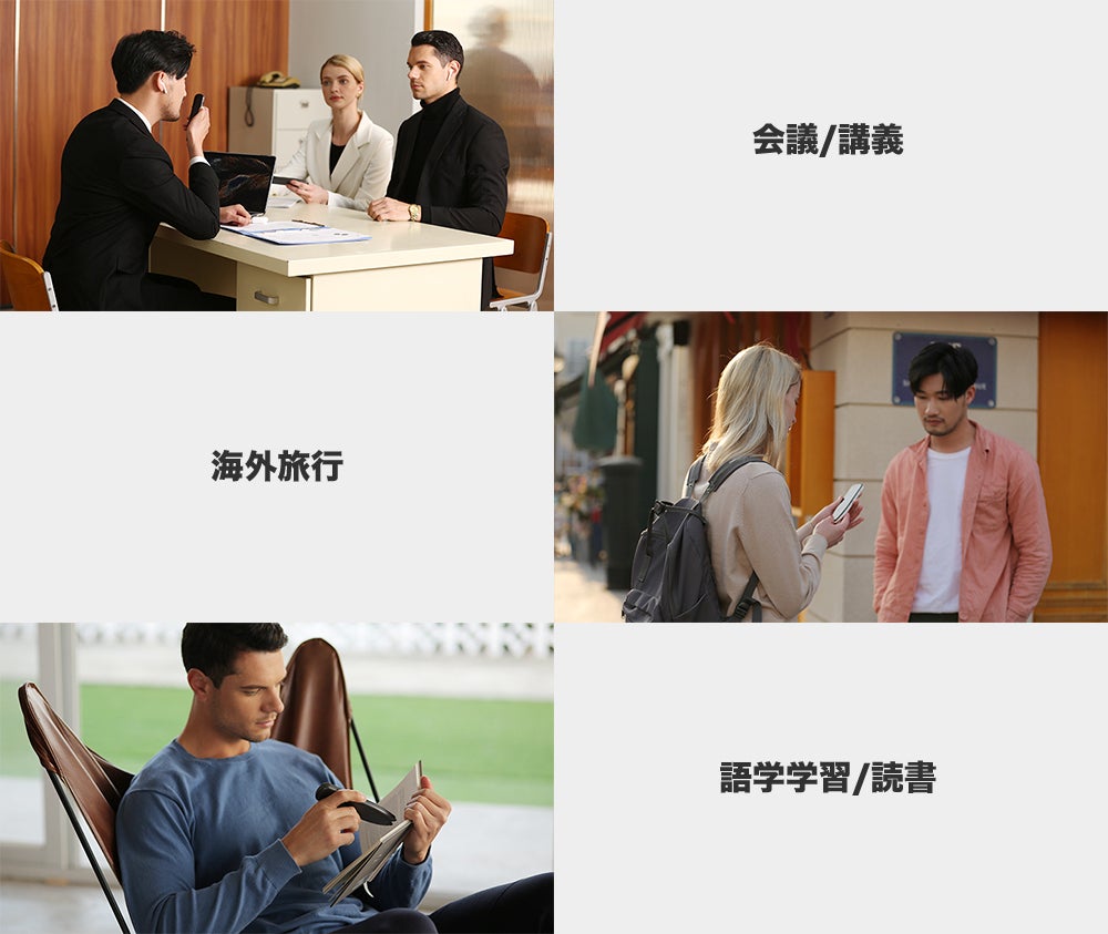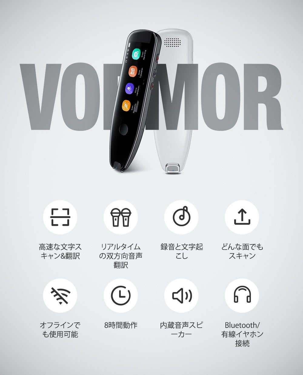 Vomorは、プロフェッショナルなハンドヘルド翻訳デバイスです。112の言語に対応しており、紙面や画面を問わずどんな面からでも文字をスキャンできる上、リアルタイムでの双方向音声翻訳にも対応しています。また、オフラインモードをサポートしているため、インターネットが使えない場所でもご使用いただけます。スマートな録音機能も備えており、重要な会議をVomorで録音した後はその音声を文字に起こしたりもできます。Vomorで、世界中の人々との言葉の壁を乗り越えましょう。