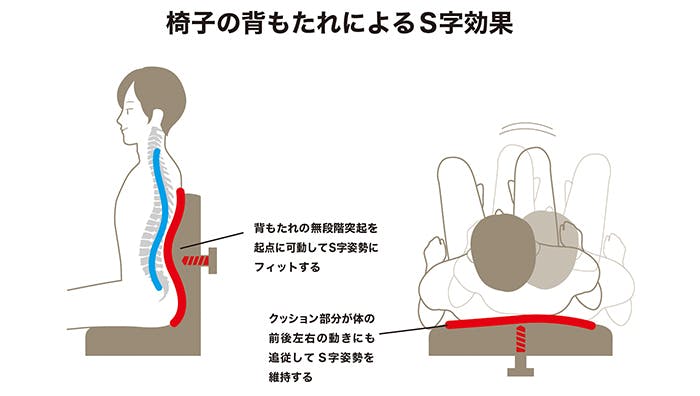 座る人の作業内容やクセによる微妙な変化にも対応しながら背中の状態に合わせて動き、「S字カーブを保てるように調整する仕組み」をつくり上げました。