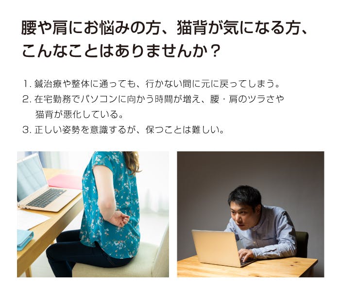 椅子に背中を合わせるのではなく、背中に合わせて動く“背中で座る椅子”が、腰や背中への負担、猫背へのお悩みを解決していきます。