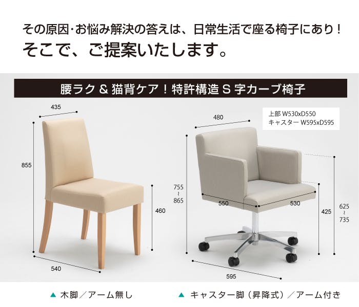 正しいS字カーブを維持できるように、「無段階突起」が背中の状態に合わせて動く特許構造。姿勢改善や腰ラクにつなげる“背中で座る椅子”を実現。