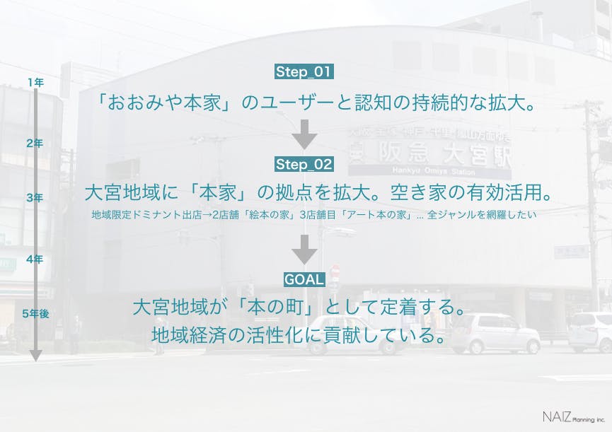 オープンから5年先を見据えた際に、私たちが目指すことは「おおみや本家」の認知が広がる先に、同じく「本の家」としての拠点を近隣に増やしていくこと。(アート本の家、絵本の家など、様々なジャンルを網羅できるように。)空き町家の活用や、本に触れるために大宮地域に訪れる人の増加で、「本の町」としての定着と、近隣の地域経済活性化を目指します。