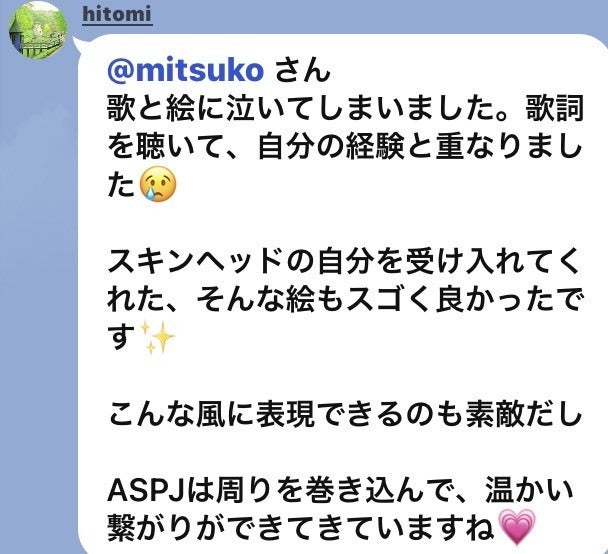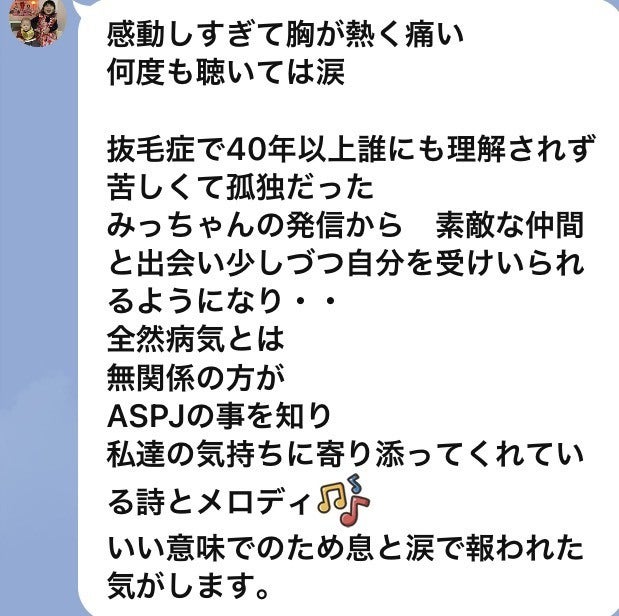 私達の想いに触れ、何日も考えぬいて書いてくださった歌詞には、「叶うこともなくあきらめた夢や届くことのないまま終わった恋もあった」という髪がない事、人と違う事で悩んでいた自分から、一歩を踏み出すことを応援して、背中を押してくれるような内容でした。