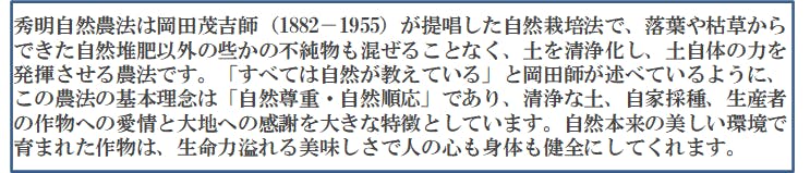 こばふぁーむは農薬、肥料を使わず作物を栽培しています。それゆえ手作業での除草、機械除草を何度も繰り返すため、一般の栽培法に比べ格段に手間ひまがかかります。その反面、肥料を使わず育てることにより硝酸態窒素が及ぼす人体への悪影響がないため、安心・安全でおいしい!農作物ができます。しかし、私たちが実施している秀明自然農法は健康にいい作物を作るだけではありません。