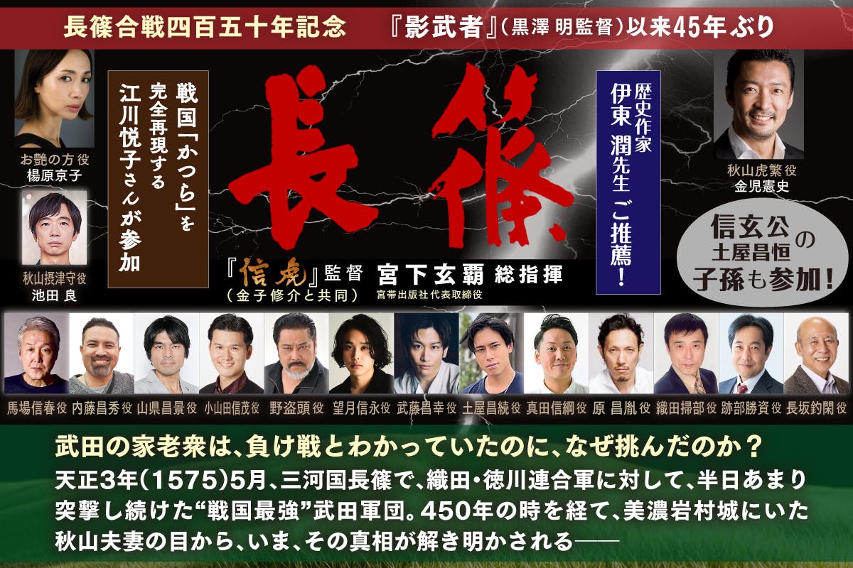 2025/04/08 13:484年前に『信虎』を製作した我が社が、いよいよ第二弾の製作に取りかかります。内容は、タイトルからもわかるように「長篠・設楽ヶ原(したらがはら)の戦い」をテーマにした物語です。同内容を扱った黒澤 明監督『影武者』より45年が経ち、今年は「長篠合戦450年」という記念すべき年です。本作の主人公は、美濃岩村城代・秋山伯耆守(ほうきのかみ)虎繁(信友)と、その夫人・お艶(つや)の方(信長の叔母)です。『信虎』から引き続いて武田勝頼、「武田四名臣」の馬場美濃守信春、内藤修理昌秀、山県三郎兵衛昌景ほか、跡部大炊、長坂釣閑、そして、新たに武藤喜兵衛(のちの真田昌幸)、小山田信茂、土屋昌続、原 隼人昌胤、真田信綱(昌幸の兄)、望月信永(典厩信繁の子)、秋山摂津守(勝頼寵臣)などの登場人物を加えた、会話を中心とした群像劇です。ちなみに、織田信長も少し登場します。そこでこちらキャンプファイヤーでクラウドファンディングを始めました。ご支援額は5,000円~1,000,000円で、それに応じたリターン品をご用意してます。撮影見学権や、なんと、出演権なども考えています。目標金額500万円を目指して頑張ります。みなさま、『信虎』に引き続きご支援よろしくお願いします。ご支援はこちらから↓https://camp-fire.jp/projects/839042/view?utm_campaign=cp_po_share_c_msg_projects_show もっと見る