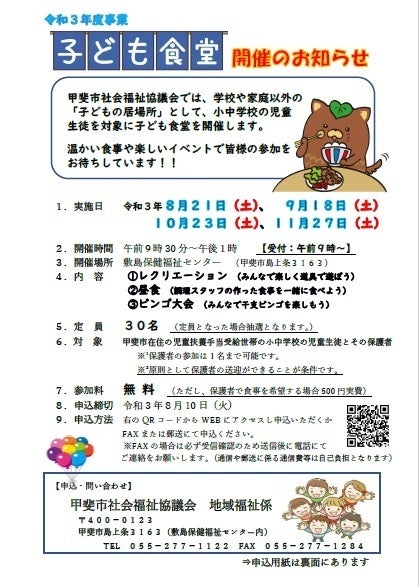 また、新たな施策として子供たちの孤食の解消や居場所づくり等を目的として、子ども食堂を8月から11月の間、月1回、計4回開催を予定しております。