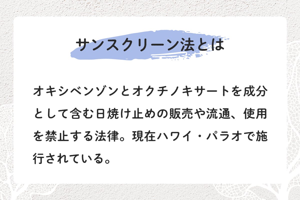 具体的には海水温の上昇から来るサンゴの白化や、海洋の酸性化による石灰化機能の低下などが挙げられますが、多くの日焼け止めに含まれる、紫外線カット成分のオキシベンゾンとオクチノキサートもサンゴの白化に影響している可能性があると言われており、ハワイでは2021年1月からサンスクリーン法が施行されています。