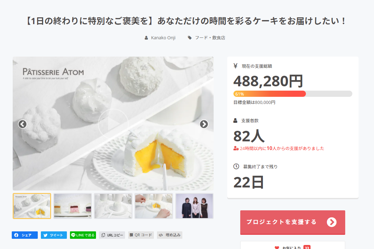 2021/04/09 11:00おかげさまで、開始72時間以内で60%を達成いたしました!!!本当にありがとうございます、、、。現時点(※)82名の支援者の皆さまをがっかりさせないためにも、残り305,720円、まだまだ頑張っていきます。(※4月8日15時時点)すでにご支援いただいた皆さまには、ぜひお近くの方にもおすすめをしていただければと思います!よろしくお願いいたします。さて、ここまでの期間で、支援者の方からご質問をいただく機会がありました。他にも同じ質問を持っている方がいらっしゃるかもしれませんので、この場でも回答させていただきたいと思います!① ケーキの周りの白い部分は、すべて生クリームですか?→3種類、以下それぞれのムースがベースとなっています。感~Tokimeki~ は、爽やかなレモンムースとパッション&オレンジ憬~Hikari~ は、ヨーグルトムースといちご&ラズベリー寧~Nodoka~ は、濃厚なチーズとブルーベリー② 商品にマーガリン、ショートニングなどのトランス脂肪酸は使用していますか?→マーガリンやショートニングは使用しておりません。バター等の乳製品には一般的に微量のトランス脂肪酸が含まれますが、人工的な油脂とは違い、牛に由来する天然のトランス脂肪酸です。③ 商品にアレルギー特定原材料は含まれますか?→以下、全商品の中に含まれる(可能性のある)アレルギー特定原材料です。「卵、乳、小麦、大豆、アーモンド、オレンジ、リンゴ、ゼラチン」それぞれの商品に関しましては、恐れ入りますがお問い合わせください。④ 周りの方に進めたいんだけど、どうしたらいい?→いくつか方法がございます。*その1「URLを送ってご紹介いただく方法」…ページのURL(→https://camp-fire.jp/projects/view/406934)をコピーして、おすすめしたい方にそのまま送っていただく方法です。*その2「贈り物としてご購入いただく方法」…住所などの情報を確認していただき、購入の際に送りたい方の住所とお名前をご記入いただく方法です。購入者様と送り先様が別であることを備考欄にわかるようにご明記ください。*その3「紹介用クーポンのあるリターンをご購入いただく方法」…5万円リターンの”準プレミアム特典”、又は10万円リターンの”プレミアム特典”をご購入いただくと、それぞれ指定人数分の90%引きクーポンを発行させていただきます。紹介したい方にクーポンをお送りいただきますと、HP開設後、ご紹介された方ご自身でクーポンを利用してご購入いただけます。紹介したい方がたくさんいらっしゃる場合におすすめです。他にもご不明な点やご質問などございましたら、お気軽にお問い合わせください! もっと見る