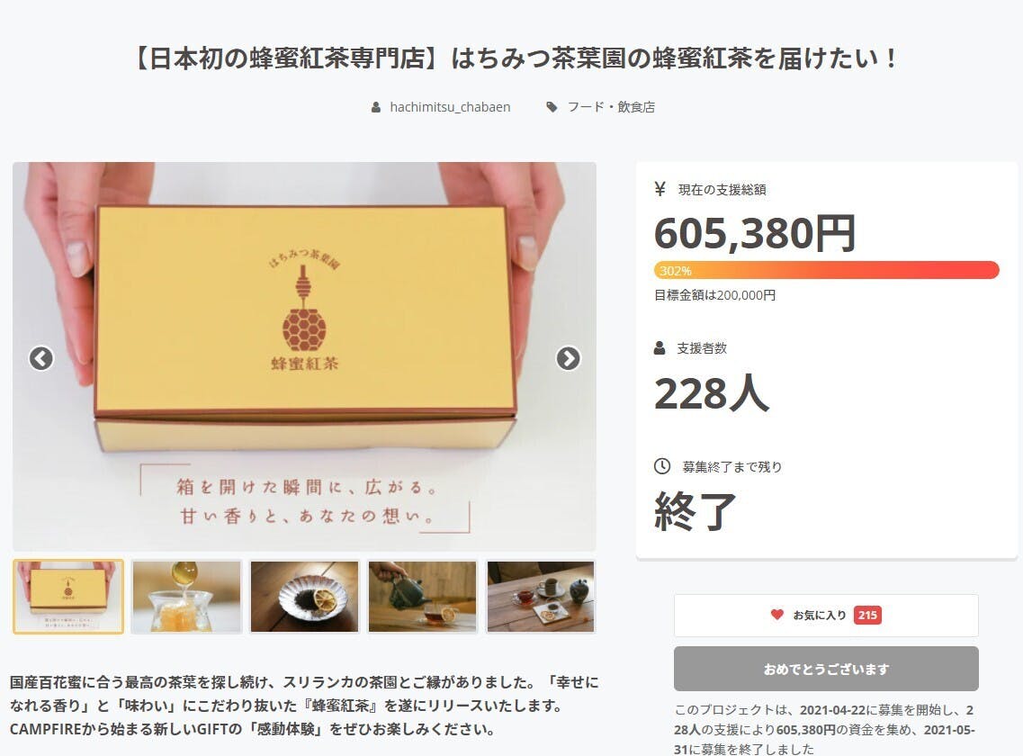 2021/06/01 08:21おはようございます。昨日、無事に募集期間が終了致しまして228名様からのご支援を頂き目標達成302%で終える事が出来ました。はちみつ茶葉園の「蜂蜜紅茶」にご興味を持って頂きました事、本当にありがとうございます。初めての事で不安とワクワクする気持ちでいっぱいでした。こんなにも沢山の人と出会いご縁があった事、本当に嬉しく思います。ご支援してもらう度にメールが届いてたのですが、こんなに嬉しいメールがあるんだなぁと楽しい1か月を過ごす事が出来ました。ご支援者様から笑顔を頂けたので今度は蜂蜜紅茶で笑顔になってもらえるように心を込めて発送準備を行っていきます。CAMPFIREを通して沢山の方との出会いがありまして現在、沢山の企業様との業務提携やタイアップ企画等が進んでおります。今回だけで終わるのではなく気に入って頂けた皆様に継続してご提供できるように励んで参りますので今後とも、宜しくお願い致します!改めて、ご支援者の皆様!CAMPFIRE掲載担当の林様!はちみつ茶葉園を支えてくれたスタッフの皆様!本当に心からありがとうございます!!はちみつ茶葉園高松信行 もっと見る【はちみつ茶葉園のリーフレットが出来上がりました!!】