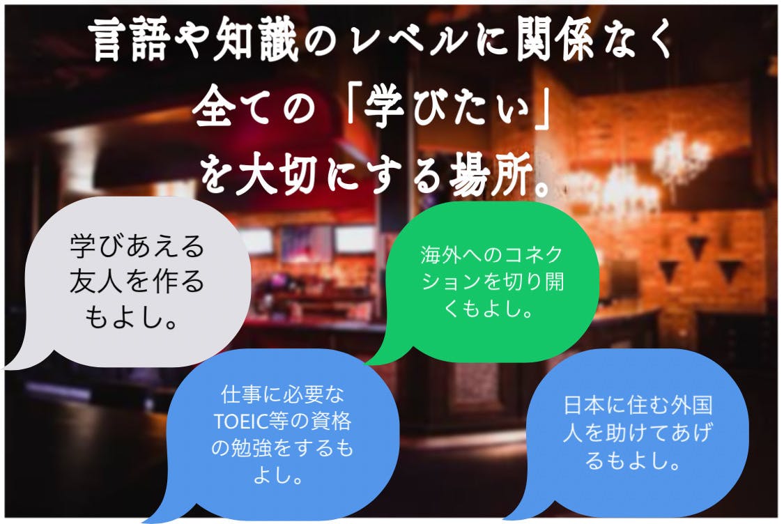 大人になっても学び合える友人は素敵だと思います。日本人同士は勿論、外国人と言語や文化について学び合うことにより、多くを学ぶことができます。そんな友人とバーだけにとどまらず是非、バーの外でもプライベートに親密な関係を築いていただけたらと思います。更に日本人同士で学び合うことにもメリットは存在しており、我々のような言語学習者同士での学習や共通の母語を持たない人同士での学習は互いの困難に気が付きやすい傾向があり、練習にはもってこいです。