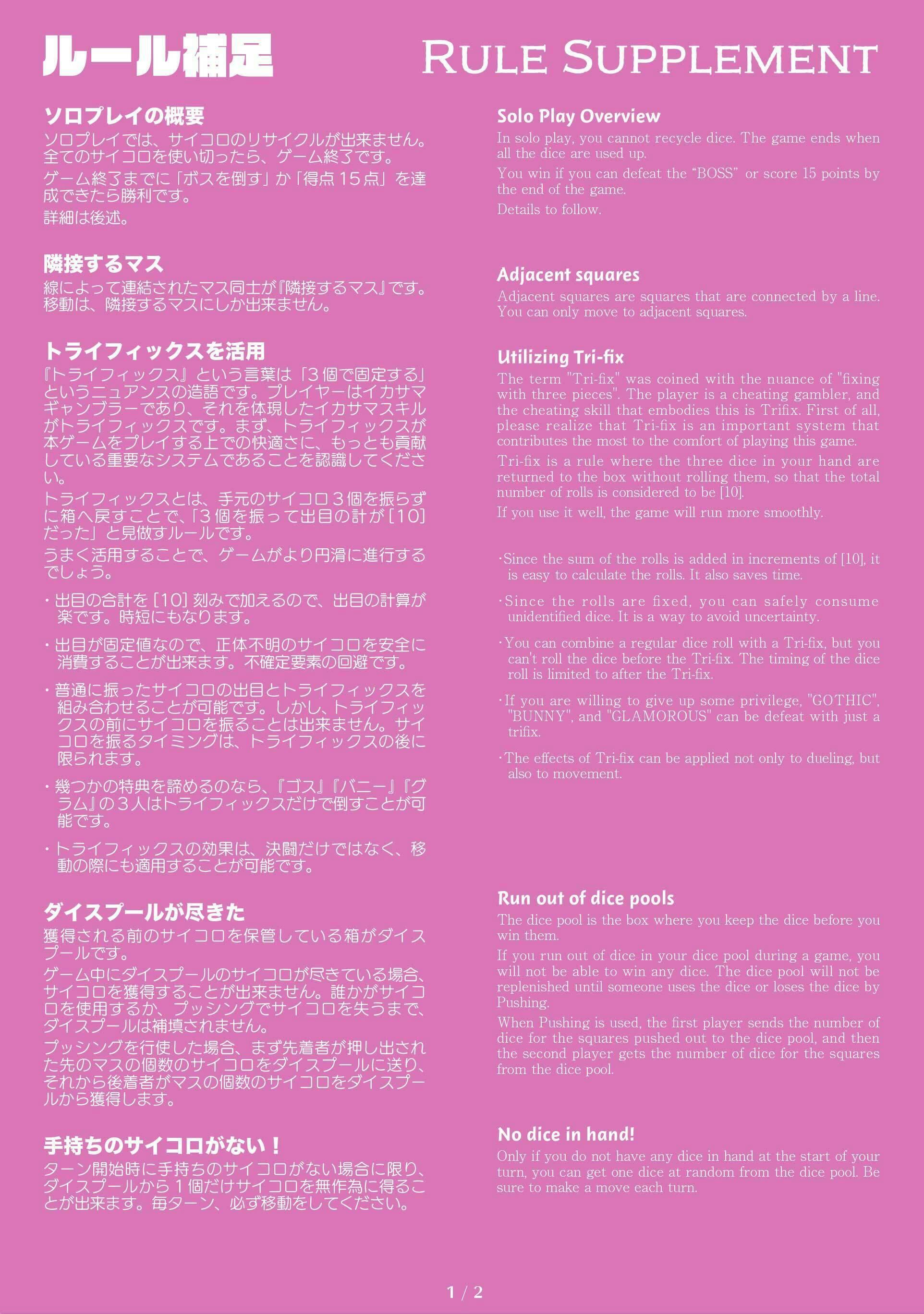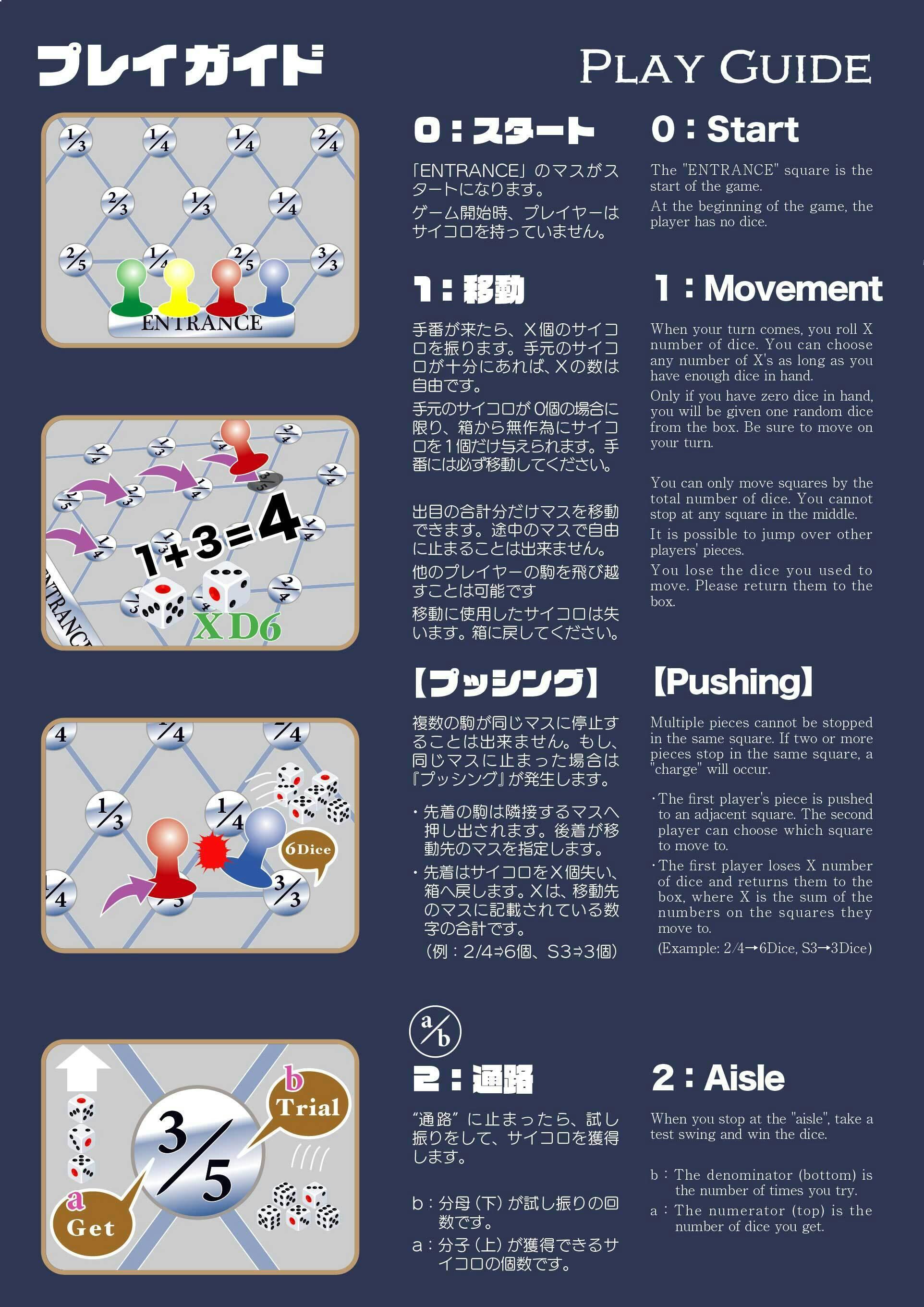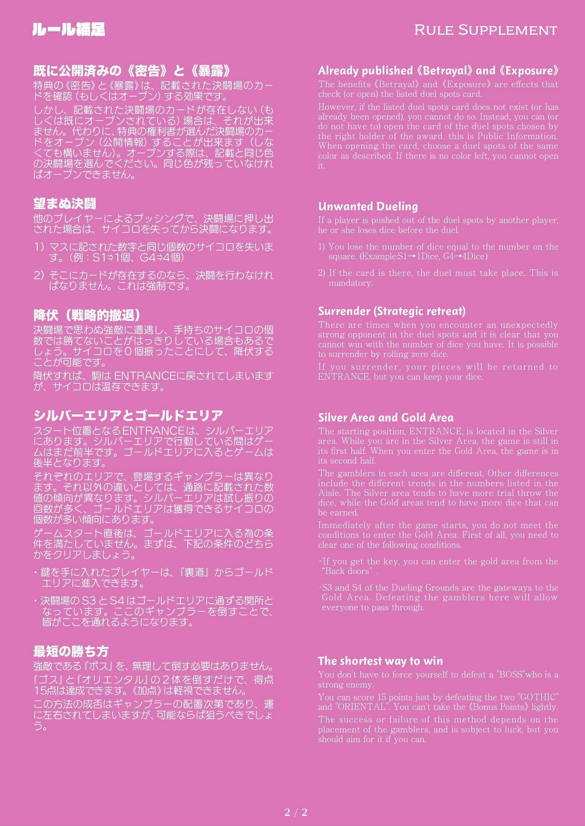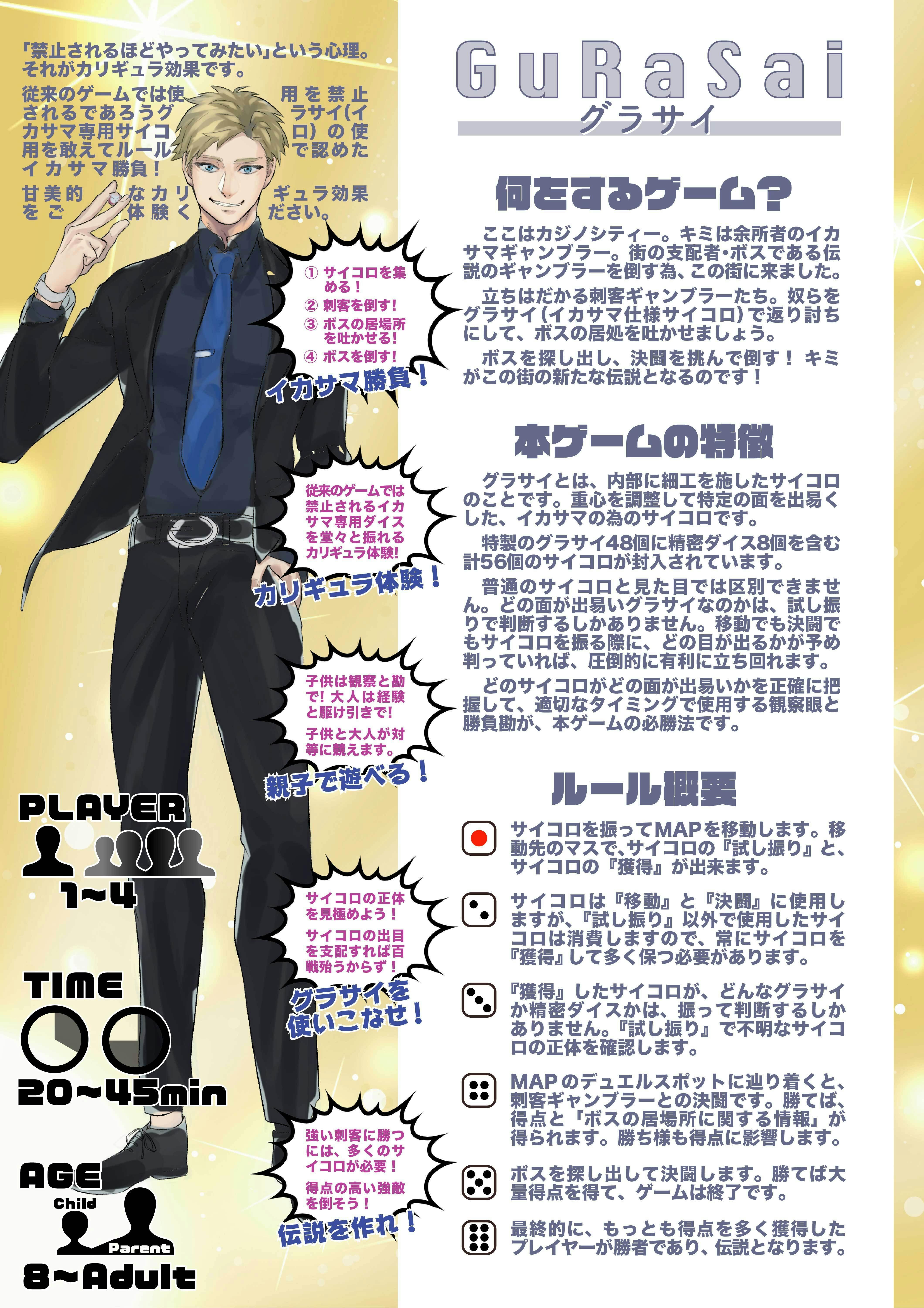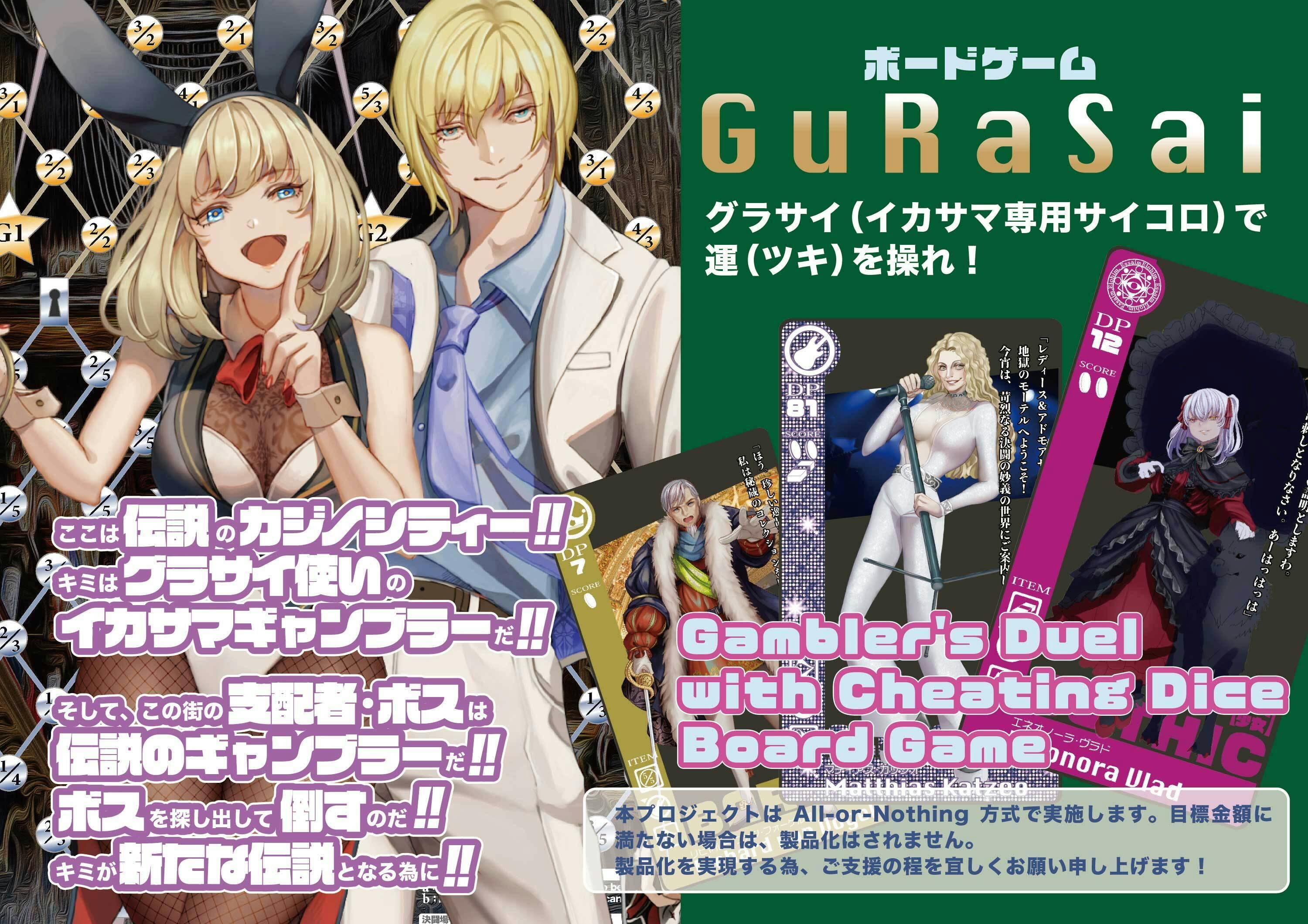 2021/05/09 07:47「何をするゲームか?」をホームで早い段階で示して欲しい、というご意見を戴きました。I've been asked to indicate early on at home, "What's the game about? We received a suggestion to show "what the game is about" early on at home.TOPイメージの4枚目と、ホームの中程には該当の画像を掲載していたのですが、確かに言われる通り、最優先に近い優先度で表示した方が概要を掴み易いですね。I had posted the 4th image on the top image and the corresponding image in the middle of the home page, but as you said, it would be easier to grasp the overview if it was displayed with priority near the top.掲載順番を差し替えようと思いますが、更新する為にはCAMPFIREの審査が必要であり、反映されるまでに時間が掛かりますので、取り急ぎ、この『活動報告』のページで該当画像をピックアップしておきます。I will replace the order in which the images are posted, but it will take time for CAMPFIRE to review them, so I will pick up the relevant images on the "Activity Report" page as soon as possible.ここはカジノシティー。キミは余所者のイカサマギャンブラー。街の支配者・ボスである伝説のギャンブラーを倒す為、この街に来ました。立ちはだかる刺客ギャンブラーたち。奴らをグラサイ(イカサマ仕様サイコロ)で返り討ちにして、ボスの居処を吐かせましょう。ボスを探し出し、決闘を挑んで倒す! キミがこの街の新たな伝説となるのです!1)サイコロを集める!2)刺客を倒す!3)ボスの居場所を吐かせる!4)ボスを倒す!◆基本情報1人〜4人(基本セット)・ソロプレイ可能なので、おひとりでも気軽に遊べます。・拡張セットなら、最大6人まで同時プレイが可能。20〜45分 が、プレイ時間の大体の目安です。・ソロプレイなら15分以内。・複数人でのプレイ時間は、早くて「プレイヤー人数×5分 +5分」、長くても「プレイヤー人数×10分 +10分」ぐらいとなります。ゲームに慣れていない場合は、さらに+15分ぐらいかかるかもしれません。・最短ルート(GOTHIC → ORIENTAL)が成功すれば、10分でクリアが可能です。8歳〜大人・子供でも理解できるシンプルルール。・大人の嗜好にも耐え得る、駆け引きと戦術。・子供と大人が対等に競えるので、ファミリーゲームとしてお楽しみ頂けます。グラサイとは、内部に細工を施したサイコロのことです。重心を調整して特定の面を出易くした、イカサマの為のサイコロです。特製のグラサイ48個に精密ダイス8個を含む計56個のサイコロが封入されています。普通のサイコロと見た目では区別できません。どの面が出易いグラサイなのかは、試し振りで判断するしかありません。移動でも決闘でもサイコロを振る際に、どの目が出るかが予め判っていれば、圧倒的に有利に立ち回れます。どのサイコロがどの面が出易いかを正確に把握して、適切なタイミングで使用する観察眼と勝負勘が、本ゲームの必勝法です。従来のゲームでは禁止されるイカサマ専用ダイスを堂々と振る。カリギュラ体験!「禁止されるほどやってみたい」という心理。それがカリギュラ効果です。従来のゲームでは使用を禁止されるであろうグラサイ(イカサマ専用サイコロ)の使用を敢えてルールで認めたイカサマ勝負!甘美的なカリギュラ効果をご体験ください。子供は観察と勘で!大人は経験と駆け引きで!子供と大人が対等に競えます。ファミリーゲームとしてもお楽しみ頂けます。サイコロの正体を見極めよう!サイコロの出目を支配すれば百戦殆うからず!強い刺客に勝つには、多くのサイコロが必要!得点の高い強敵を倒そう!1)サイコロを振ってMAPを移動します。移動先のマスで、サイコロの『試し振り』と、サイコロの『獲得』が出来ます。2)サイコロは『移動』と『決闘』に使用しますが、『試し振り』以外で使用したサイコロは消費します(箱に戻します)ので、常にサイコロを『獲得』して多く保つ必要があります。3)『獲得』したサイコロが、どんなグラサイか精密ダイスかは、振って判断するしかありません。『試し振り』で不明なサイコロの正体を確認します。4)MAPのデュエルスポット(決闘場)に辿り着くと、敵ギャンブラーとの決闘です。勝てば、得点と「ボスの居場所に関する情報」などの特典が得られます。勝ち様(PERFECT、GREAT、NICE)も特典に影響します。5)ボスを探し出して決闘します。勝てば大量得点を得て、ゲームは終了です。6)最終的に、もっとも得点を多く獲得したプレイヤーが勝者であり、伝説となります。 もっと見る