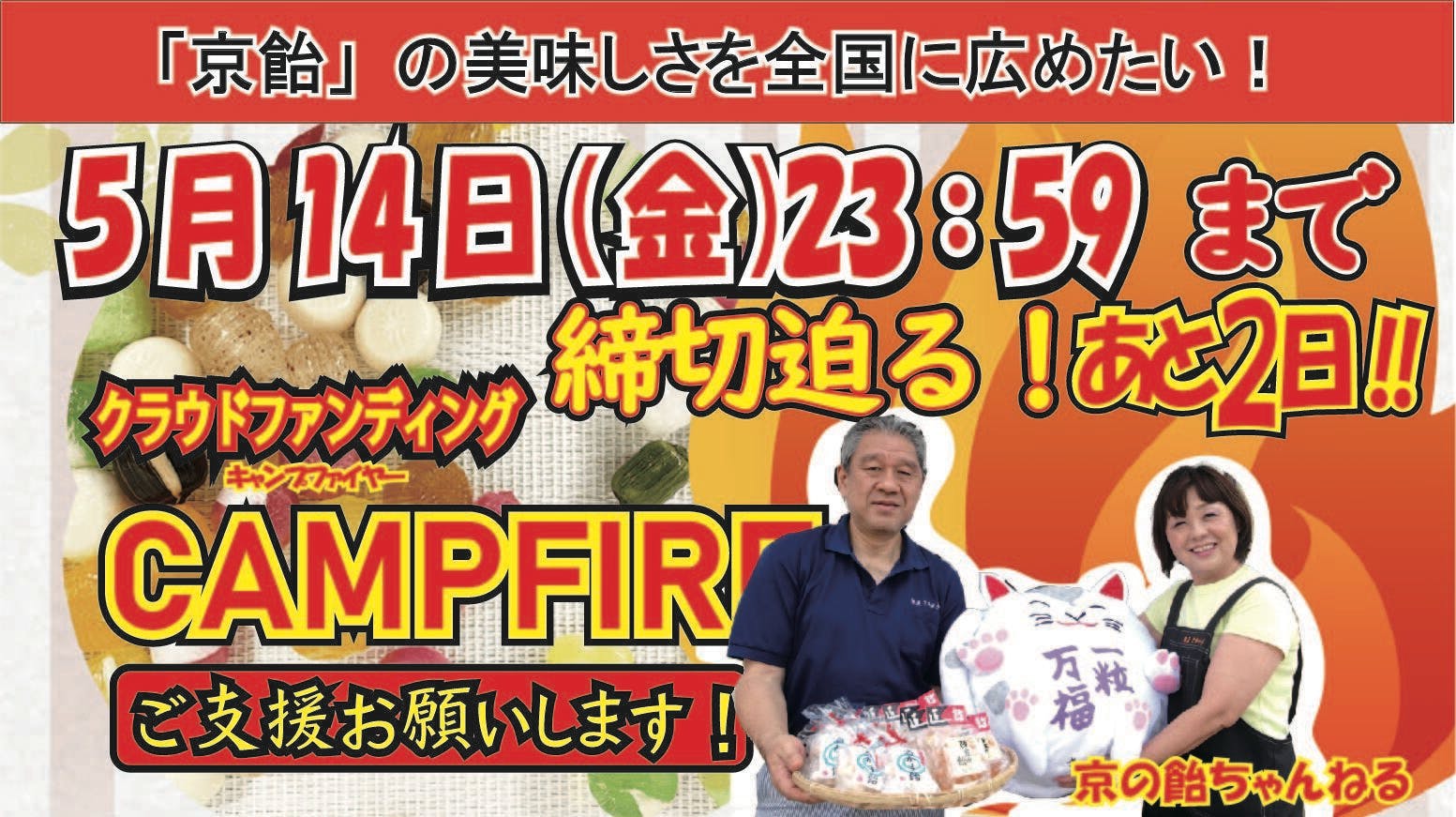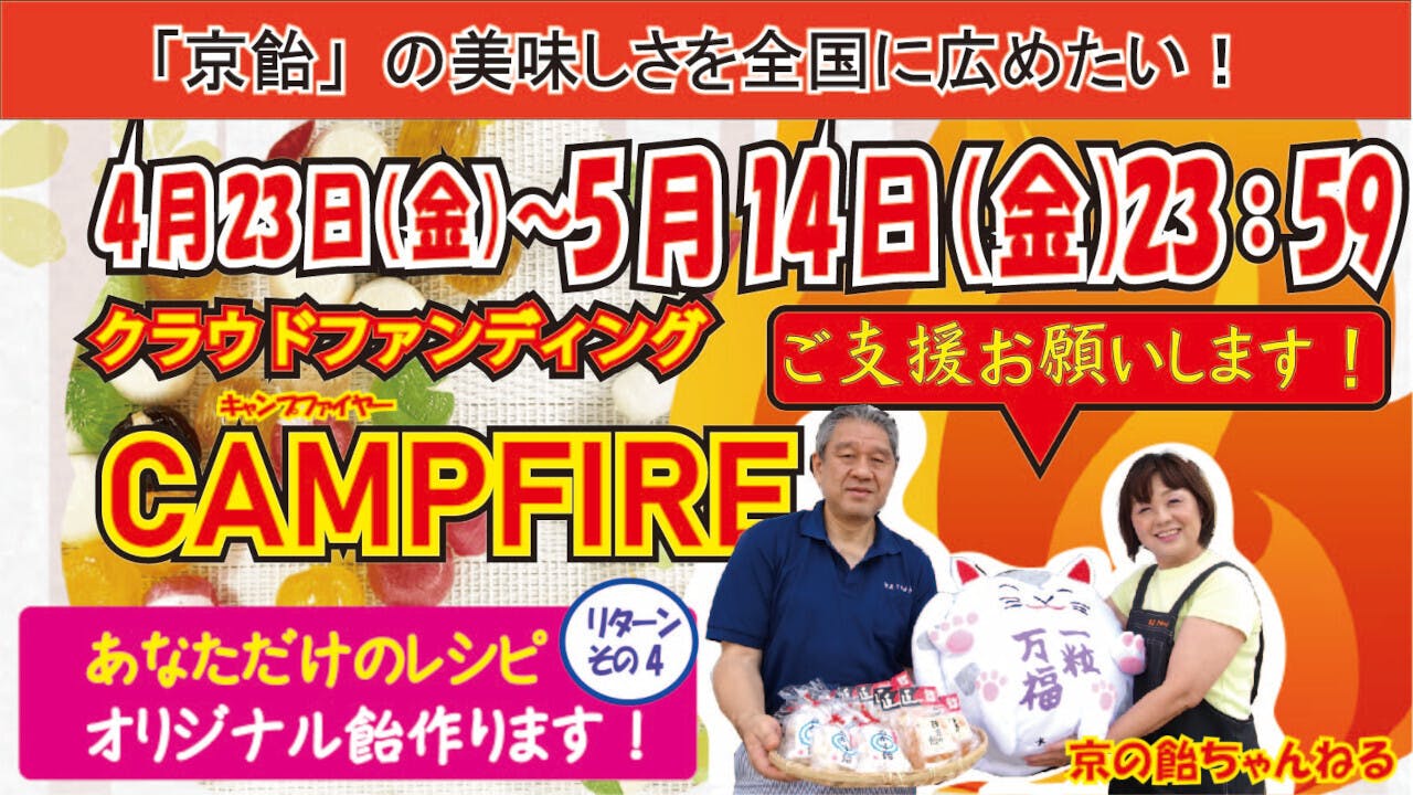 2021/05/12 11:38ご支援者の皆さまこの度は私たちのプロジェクトにご支援いただき、ありがとうございます。プロジェクト終了まであと2日となってまいりました。皆さまの温かいご支援に感謝申し上げます。現在のところCAMPFIREでの目標金額達成には残念ながら至っていないためプロジェクトのシェア等、支援者様のさらなるご協力をしていただけますと幸いです。こちらのリンクをシェアいただければと思います。https://camp-fire.jp/projects/view/407643なにとぞ、これからもご支援いただきますようお願い申し上げます。「飴匠さわはら」のホームページでは期間限定で下記の商品が発売中です!!宜しければ、弊社ホームページもご覧くださいね!https://www.kyoame.co.jp/shop/products/detail.php?product_id=174【今だけ20%off】京都の和飴詰合せ 230g 通常価格540円→432円 もっと見る