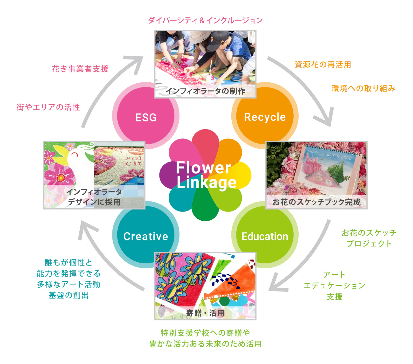 私たちが思い描く“花のリンケージシステム”とは、「インフィオラータ」で使用された花を、その鑑賞で役目を終わらせるのではなく、再資源化させることで「お花のスケッチブック」として甦らせます。そして「お花のスケッチブック」は障がい児童達のアートエデュケーション支援として教育機関に寄贈、子供たちが描いた絵は、再び「インフィオラータ」の作品として制作され、そこで使用された花は再び再資源化され、「お花のスケッチブック」として甦ります。