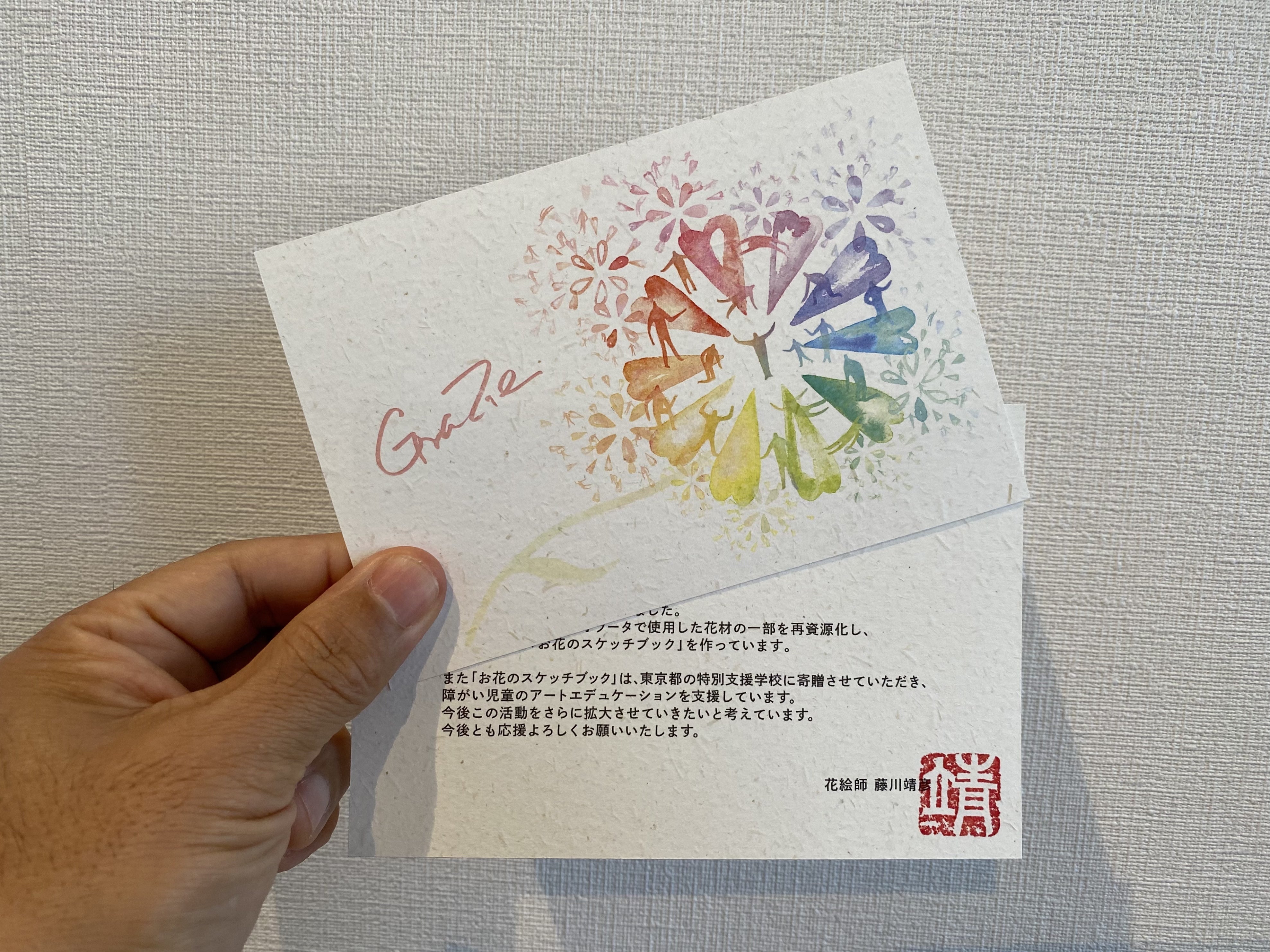 クラウドファンディング限定、東京インフィオラータ2021オリジナルポストカードによるお礼のお手紙を送らせていただきます。花絵師 藤川靖彦の落款を押印します。