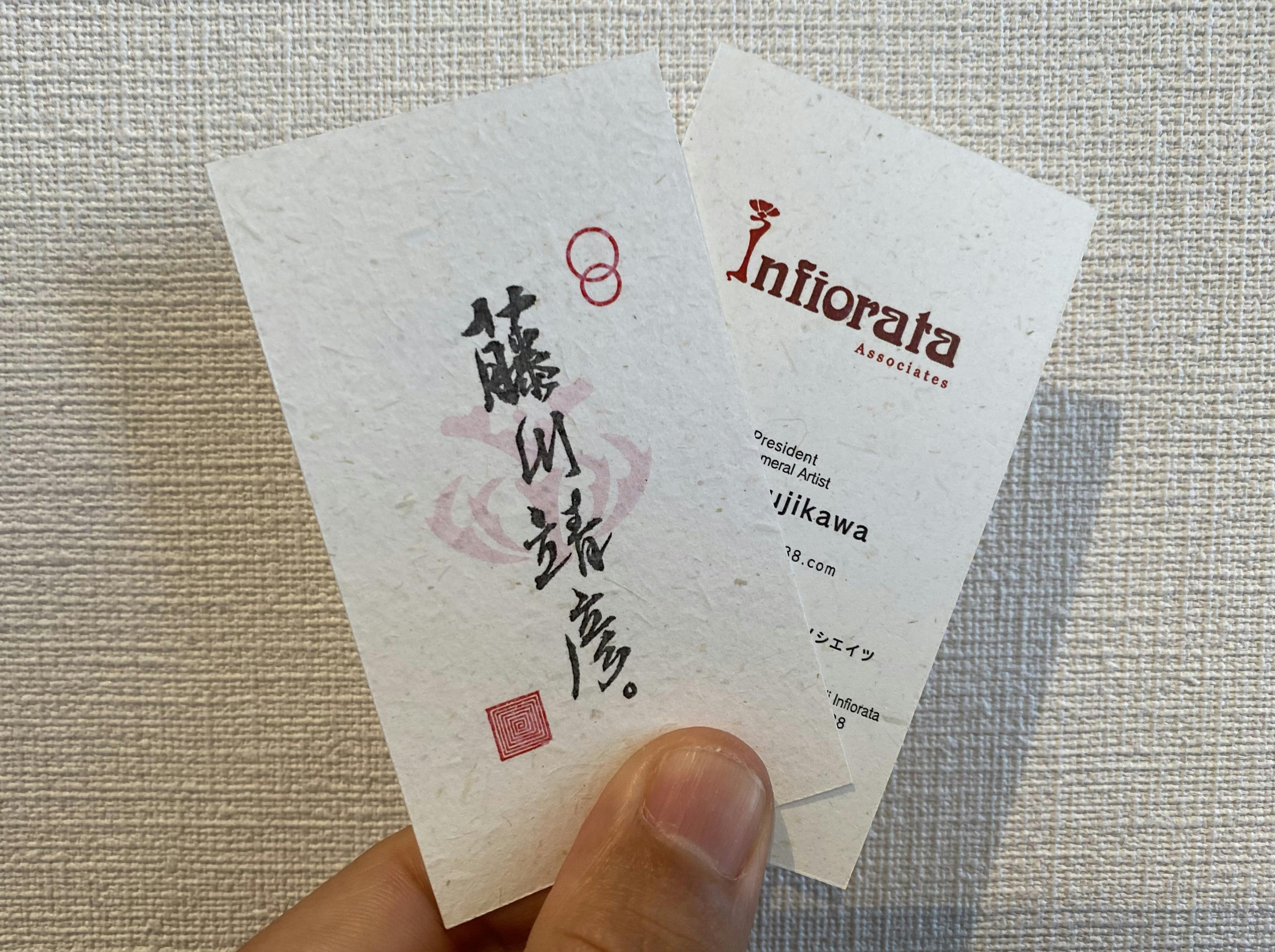 東京インフィオラータ2021で使用したカーネーションの花と茎の再生紙で作ったオリジナル名刺をお届けします。基本デザインであれば、名刺データ作成します。(限定50口)