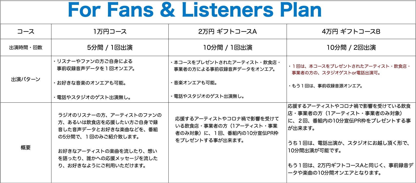 応援するアーティストや、コロナ禍で影響を受けている飲食店・事業者の方(1アーティスト・事業者のみ)に、番組内の10分間宣伝枠を1回のみプレゼントする事が出来るコースです。