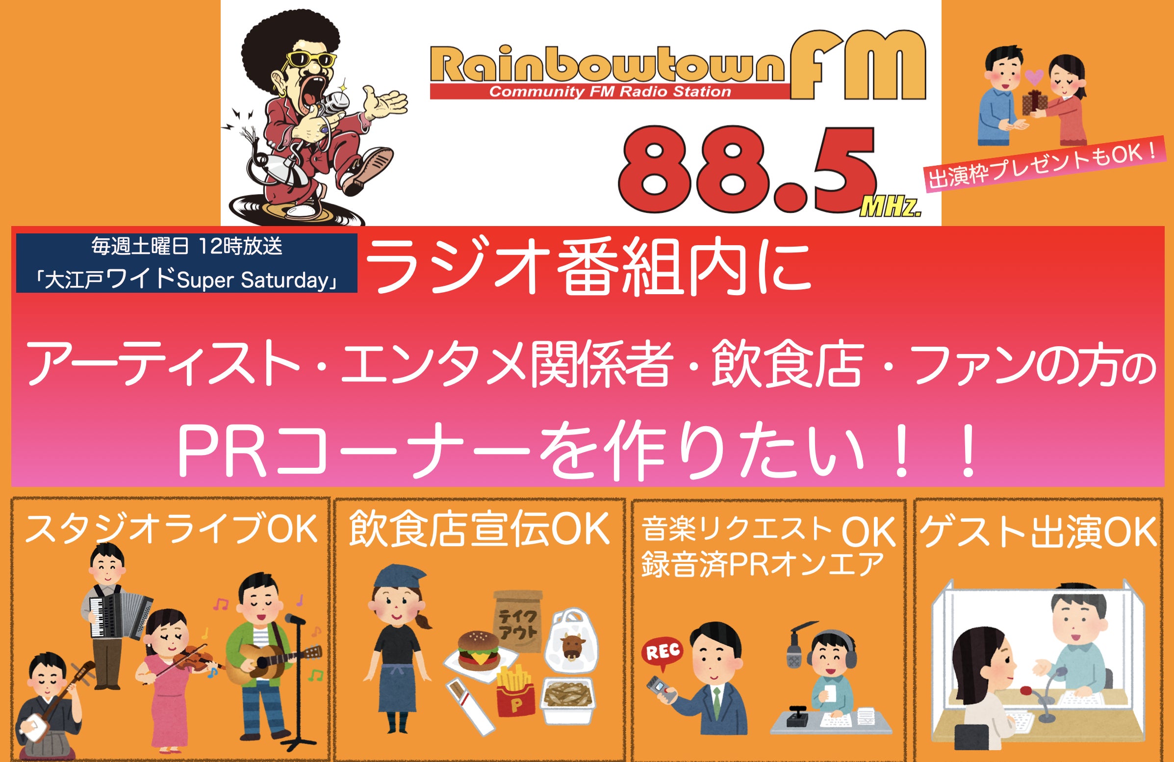 レインボータウンFMで毎週土曜日昼12時から放送の番組「大江戸ワイド Super Saturday」に、コロナ禍のミュージシャン・エンタメ演者・関係者・飲食店の方々が、安価で使えるPRコーナーを新たに作るプロジェクトです。ファンの方が応援したい人をサポートできる仕組みも導入します!
