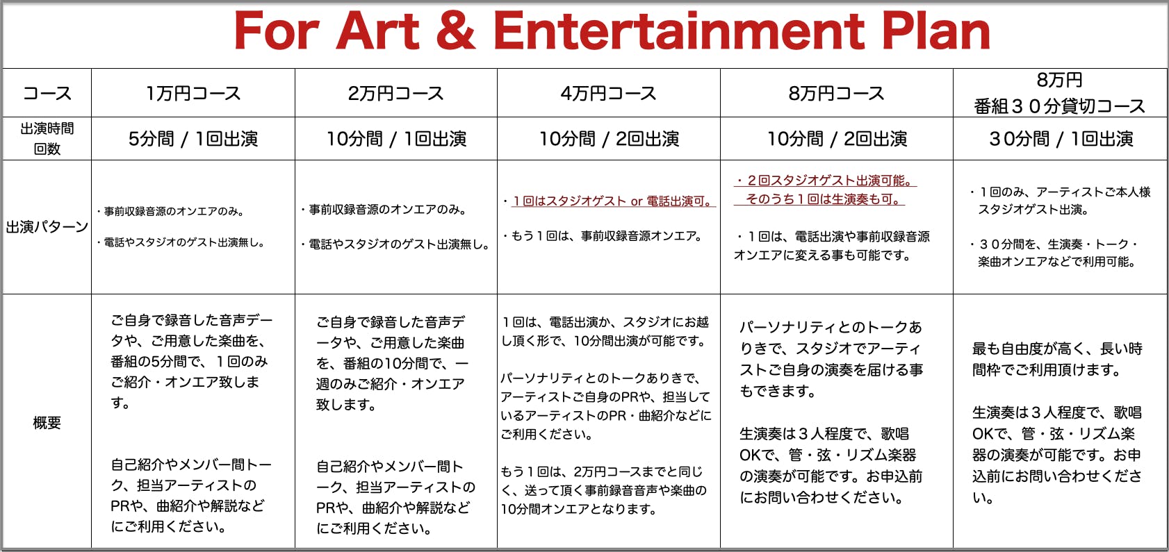 番組出演をご希望するアーティスト・関係者・飲食店の方々や、応援するアーティストに出演枠をプレゼントしたい方々は、本プロジェクトの支援者として各コースをお選び頂く事で、設定された内容と時間枠で、番組をプロモーションの場としてご利用頂けます。