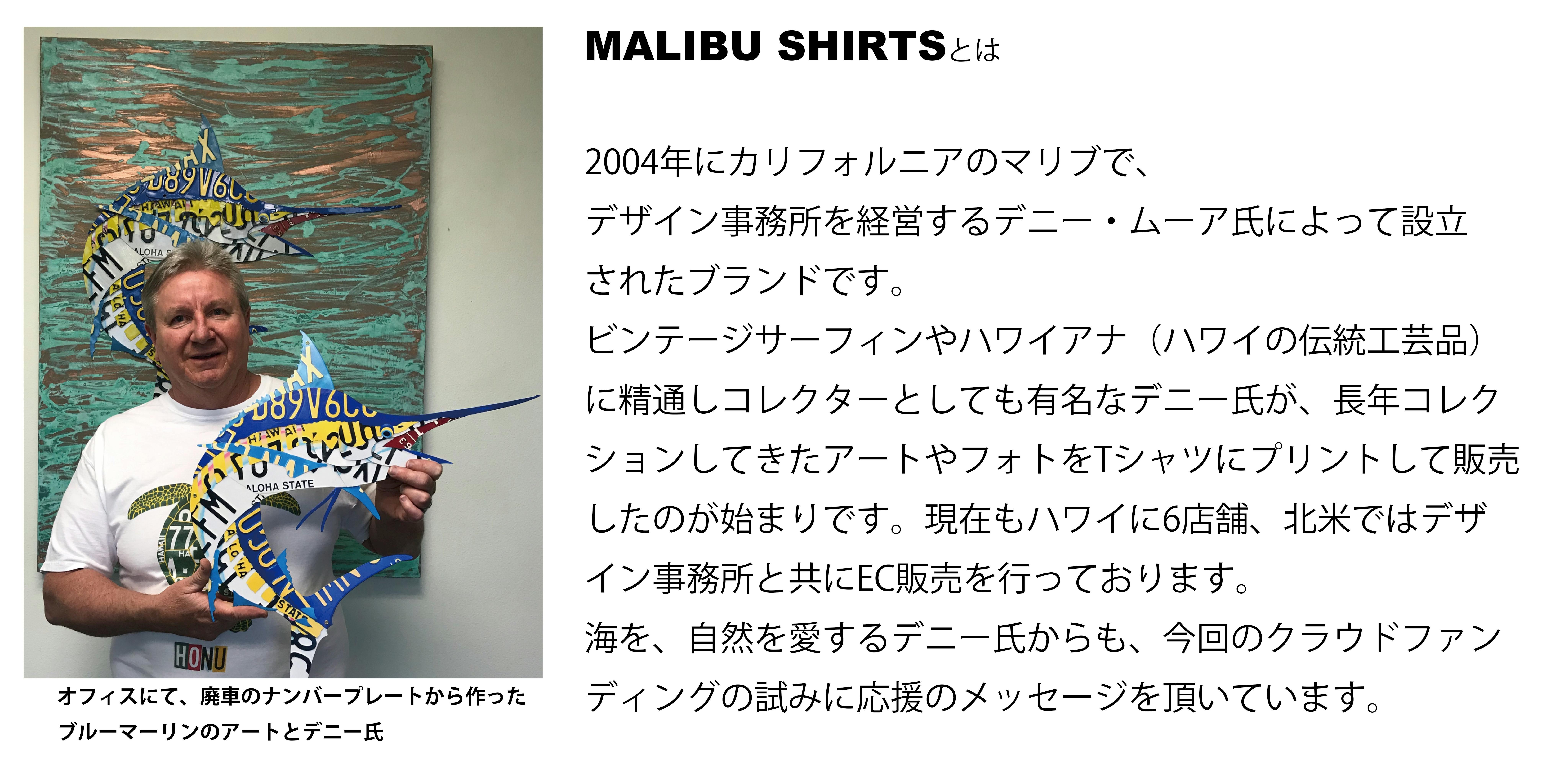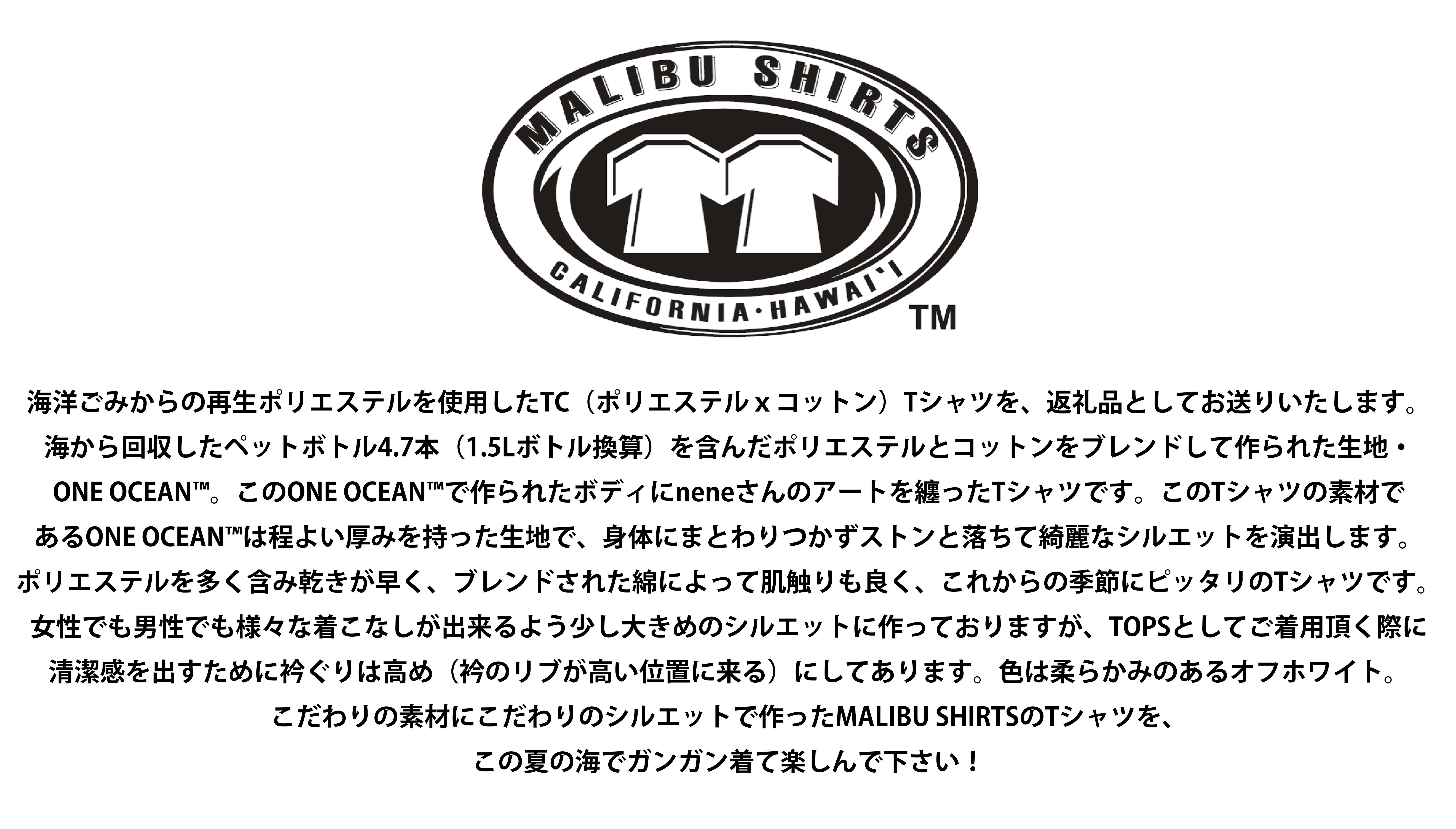 返礼品は、アーティストneneによるCAMPFIRE限定描き下ろしアートのプリントされたMALIBU SHIRTSのTシャツです!