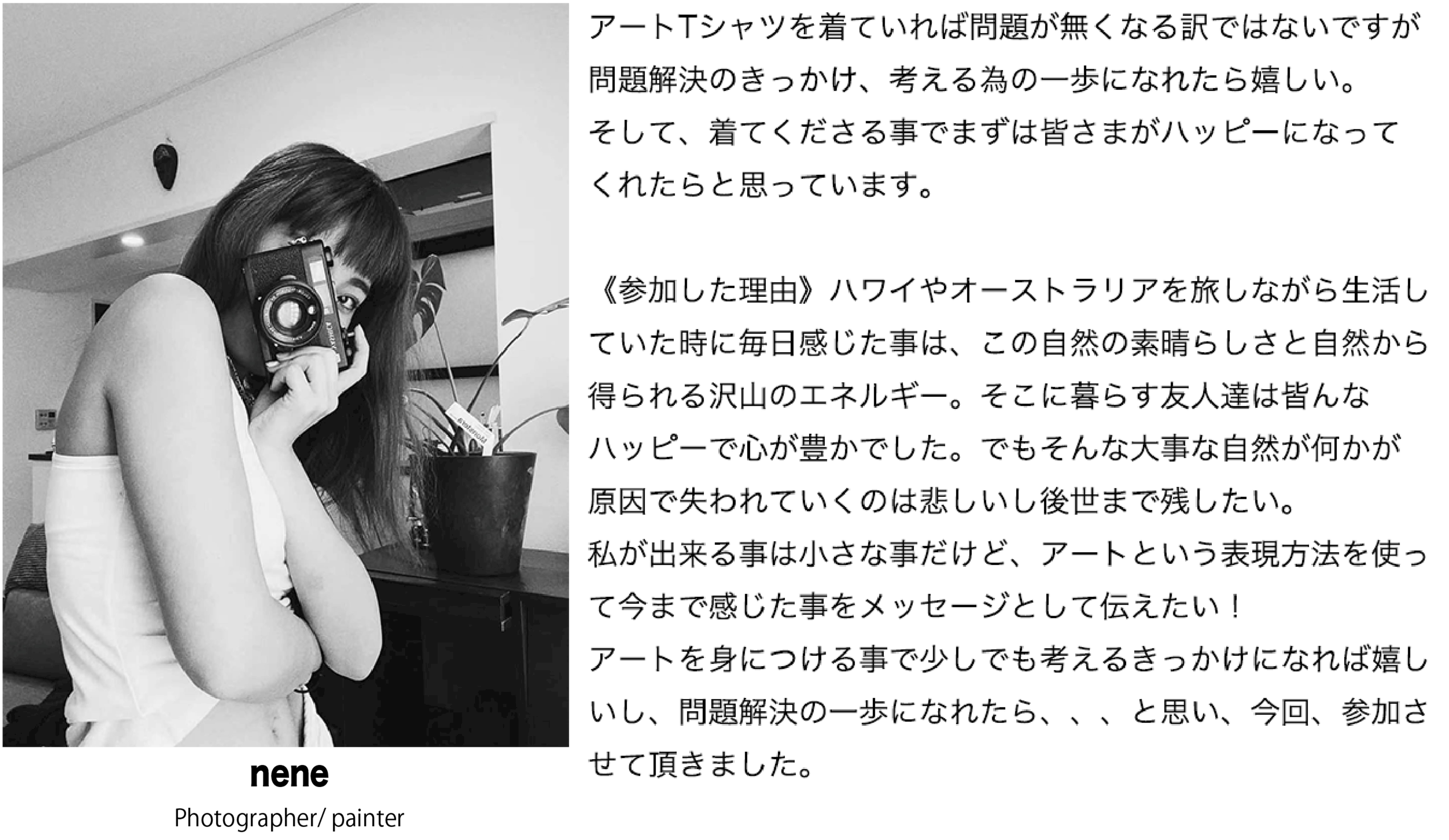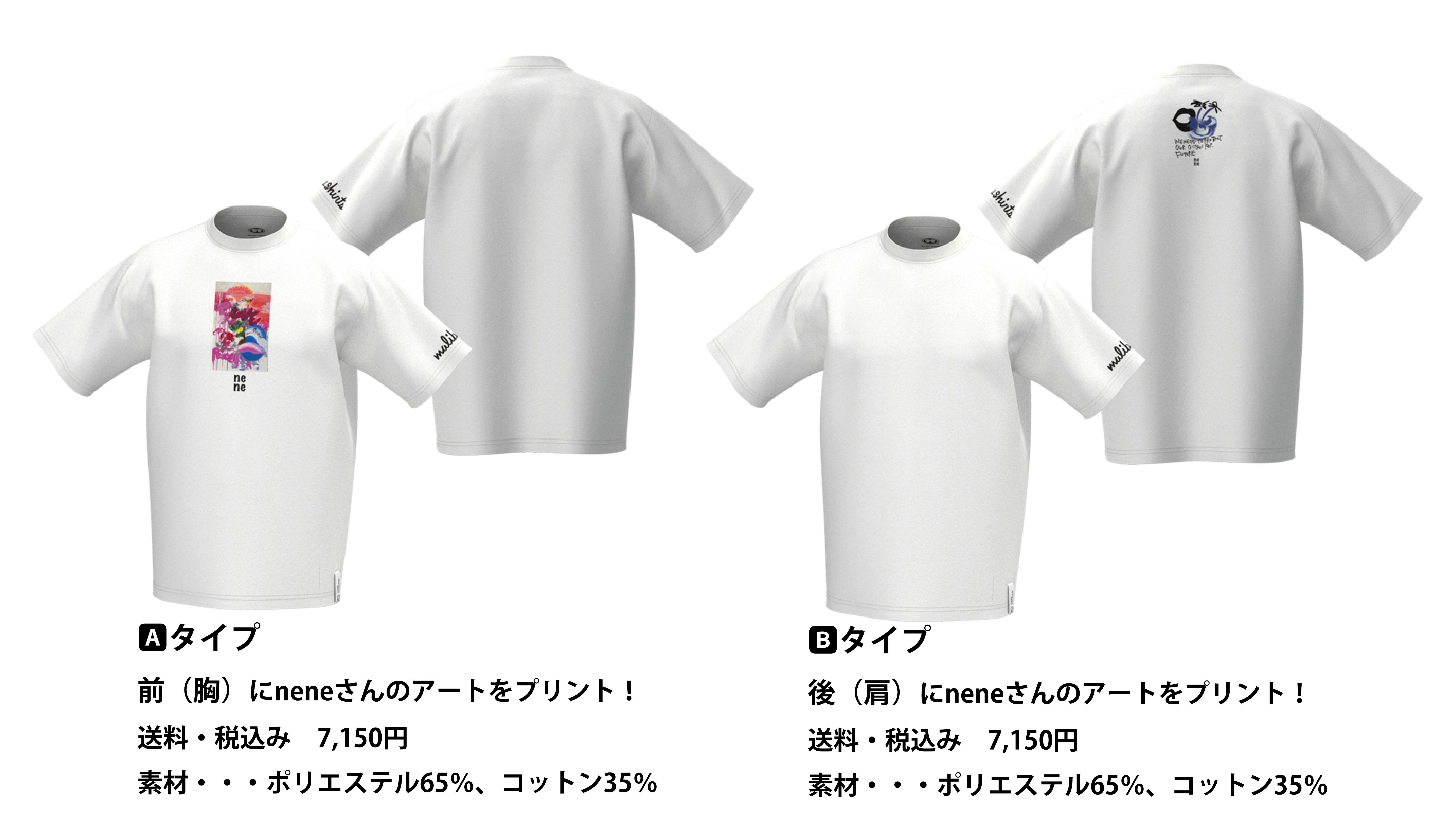 A:現在の所、今回のプリントTシャツと同型のものの販売予定は御座いません。但し、今後もアーティストneneさんと共同でモノ作りをして行く可能性は御座います。