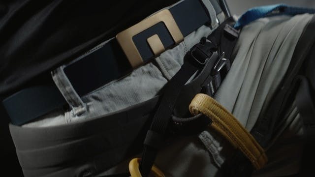 このバックルは一度装着すると、ベルトを引っ張っても水平方向にスライドしない構造になっているので、自分の好きな締め具合でベルトを無段階でアジャスト可能。