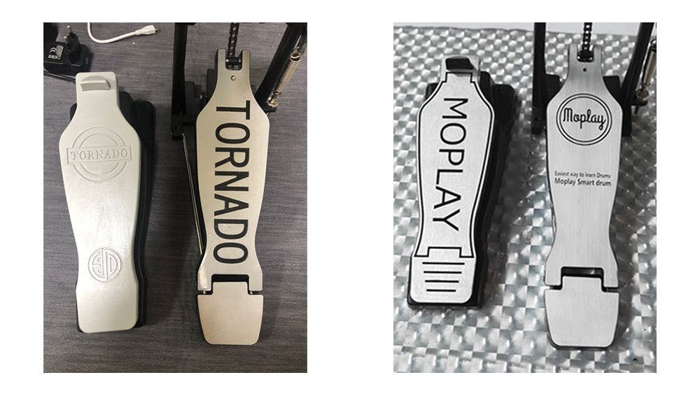従来のプラスチックハイハットペダルを、新たにメタルペダルに変更。金型を新しく製作してロゴをプリントしました。