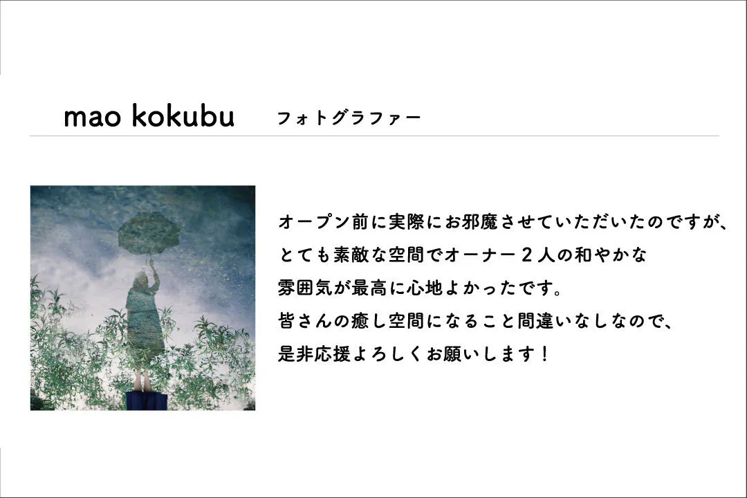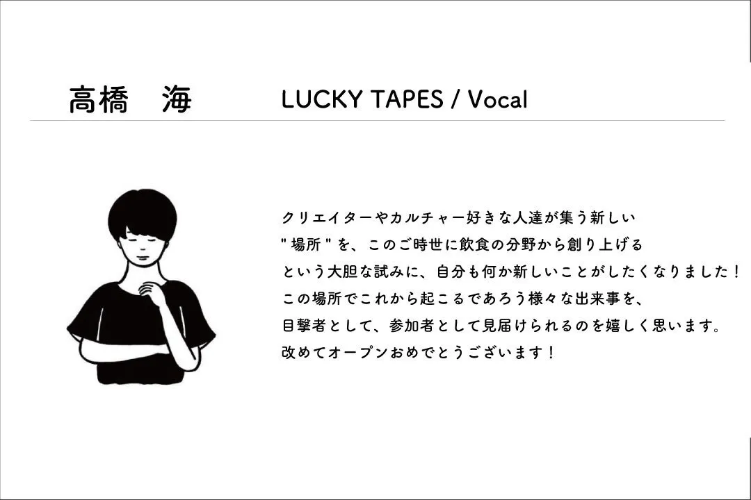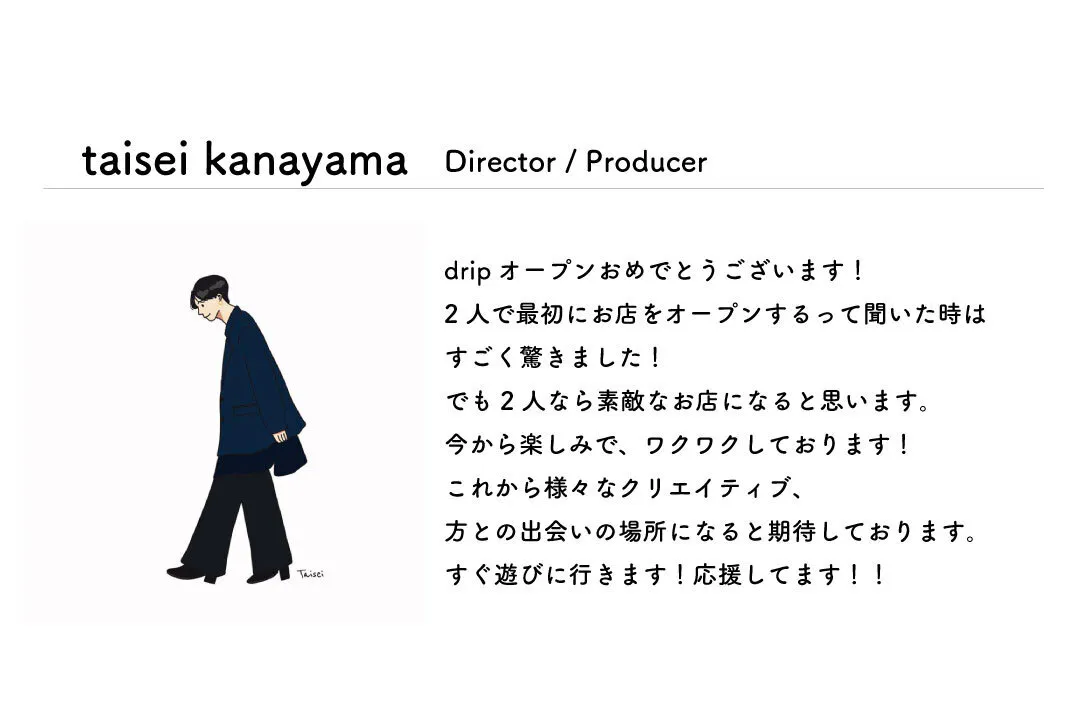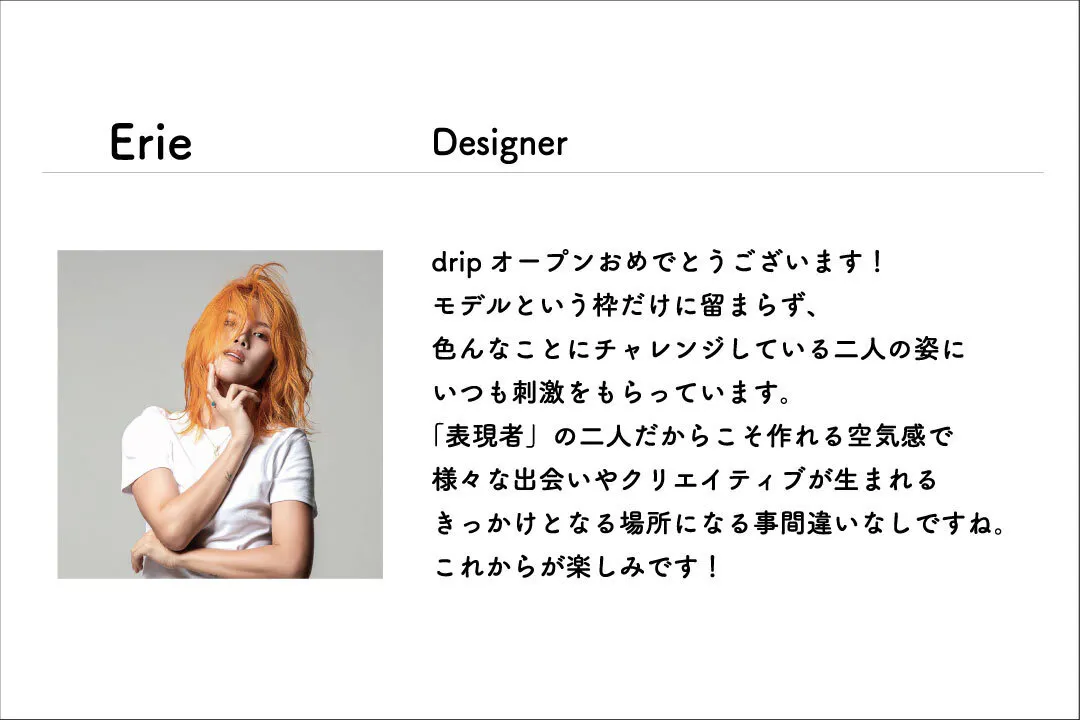 コロナ禍で私たちの生活は激変し、会社で働く人はもちろん、我々モデルやアーティスト、クリエイターたち、そして飲食店は大変な苦境に立たされました。自分自身、友人がモデルをやめたり、好きなお店や知人のお店が閉店してしまったりと考えさせられることが多い一年でした。しかし、そんな情勢だからこそ人と人とが交流することの価値を再認識したいと思い、今回のdrip出店に踏み切りました。私たちdripチームにできることは少ないかも知れませんが、だからこそ皆さんのお力をお借りし、お店に関わってくれる人に癒しや活力を与え希望を生むような空間を作って生きたいと願っています。