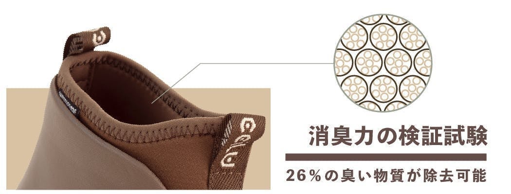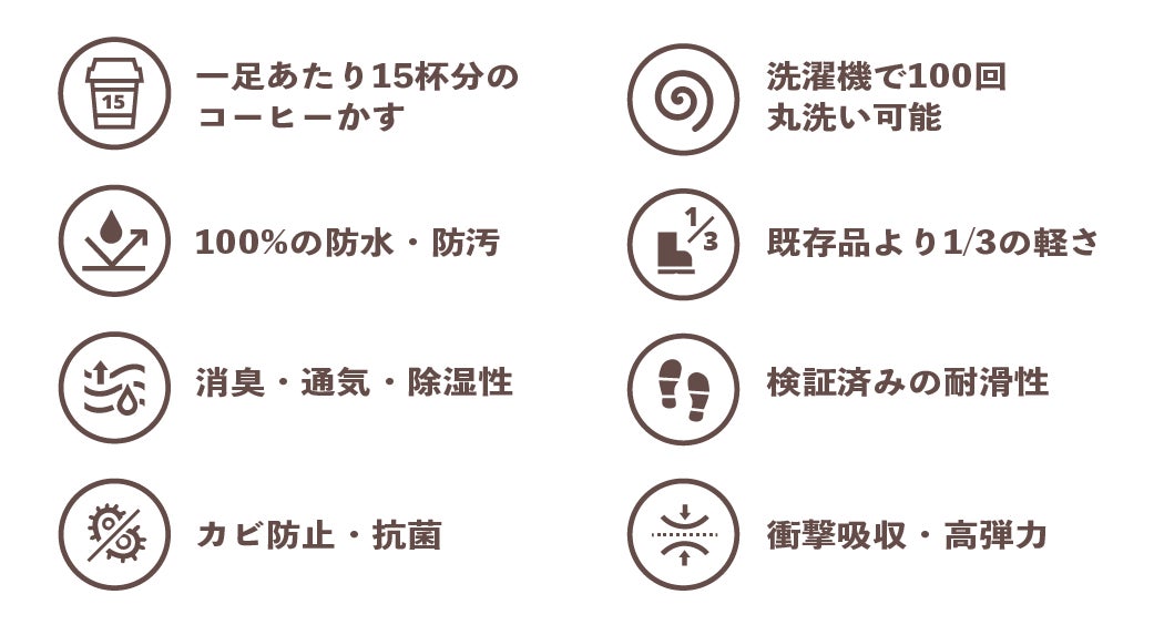 「Panto全天候型防水コーヒーブーツ」はアッパーからソールや糸まで丸ごと、15杯分のコーヒーかすでできています。そのため、コーヒーかすならではの消臭力・除湿力・通気性・速乾性が備わっていて26%の臭い物質を除去するのが可能です。