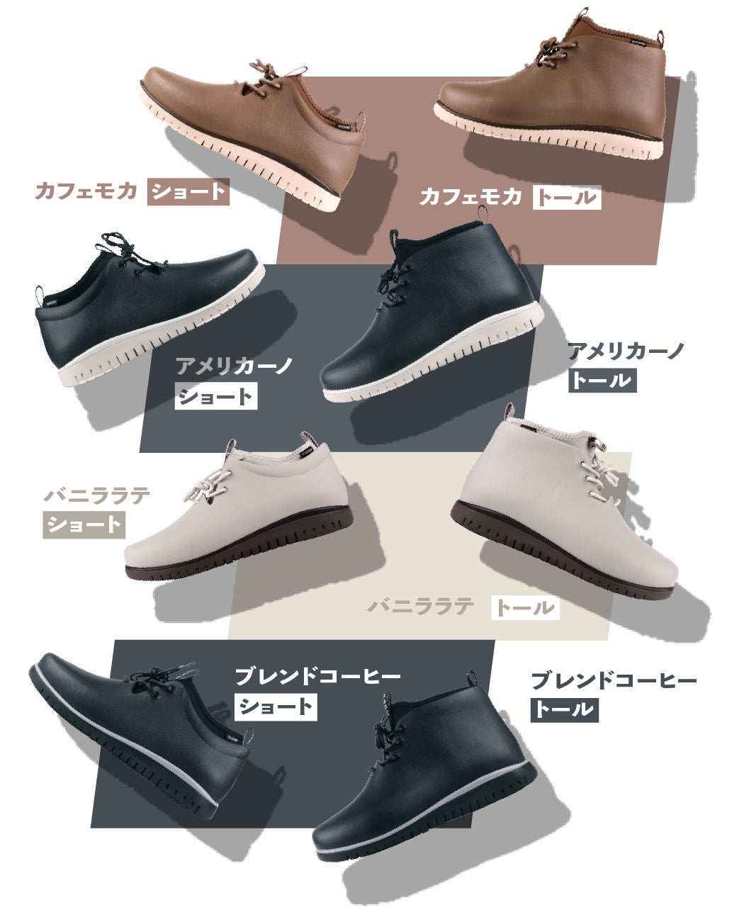 「梅雨の時期靴が濡れてしまって履き替えたいけど臭いが気になる」、「雪道では転倒しやすいし、積もった雪が靴を濡らしてしまった」、「山登りかキャンプに行ったら汚れた靴の洗濯が大変。」今までのレインブーツは重くて、そして通気性、耐滑性、洒脱さのないというイメージのですが、それを一変させる「Panto全天候型防水コーヒーブーツ」が誕生。