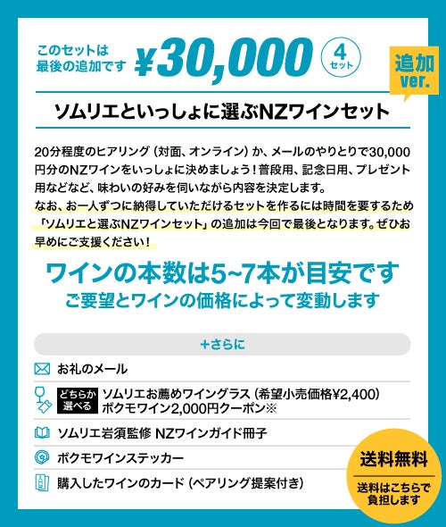 ・「はじめてのNZワインセット」完売につき、新たに「追加ver.」を設けました。