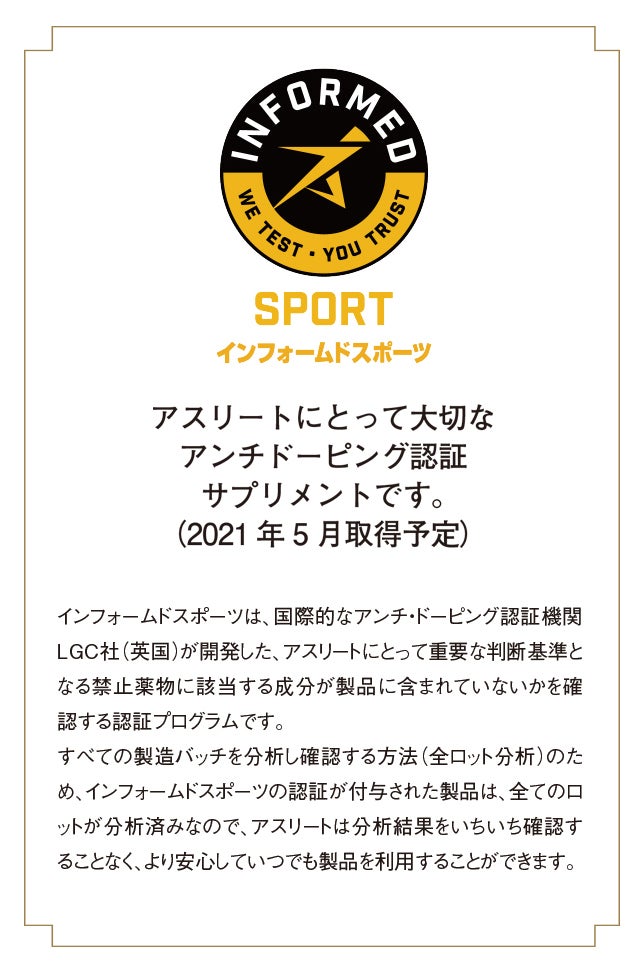シーズン・オフシーズンを通じてベストコンディションを保ち、自己ベストをキープするために栄養バランスをマネジメントするスポーツニュートリジョンサプリメントです。