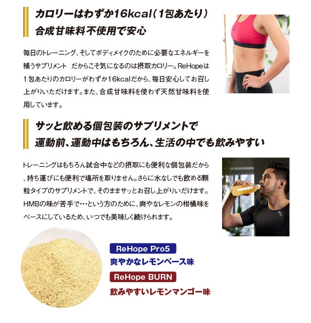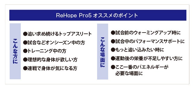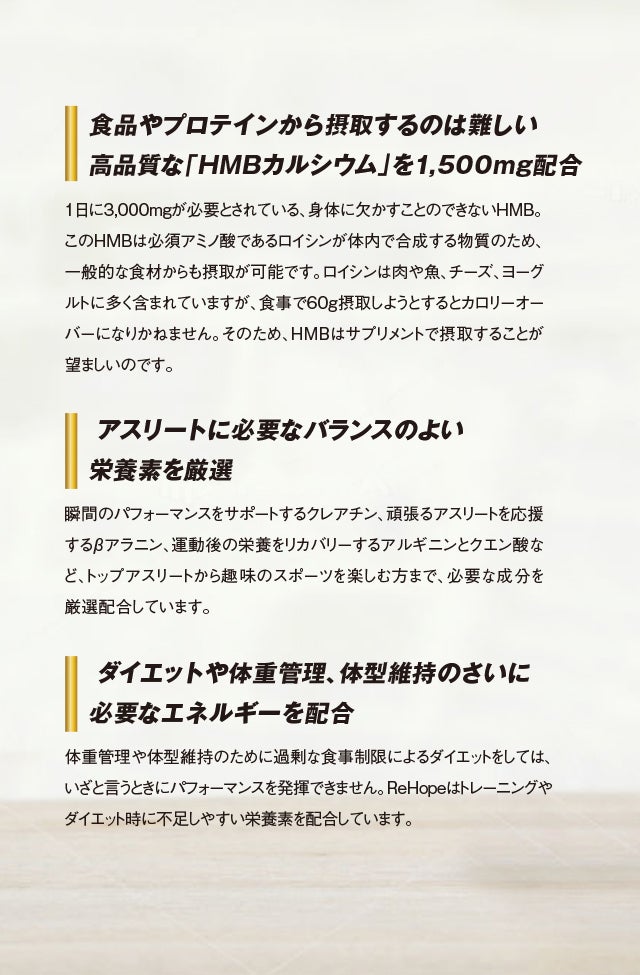 身体に必要な成分をベストなバランスで独自に配合したReHopeは、トップアスリートはもちろん、アマチュアスポーツを楽しむ方、ダイエット時に不足した栄養を補いたい方にお届けしたいサプリメントです。