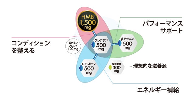 国産の高品質HMBカルシウムをはじめ、パフォーマンスサポートに役立つクレアチンを配合。さらにβアラニンがアスリートを継続的にサポート。