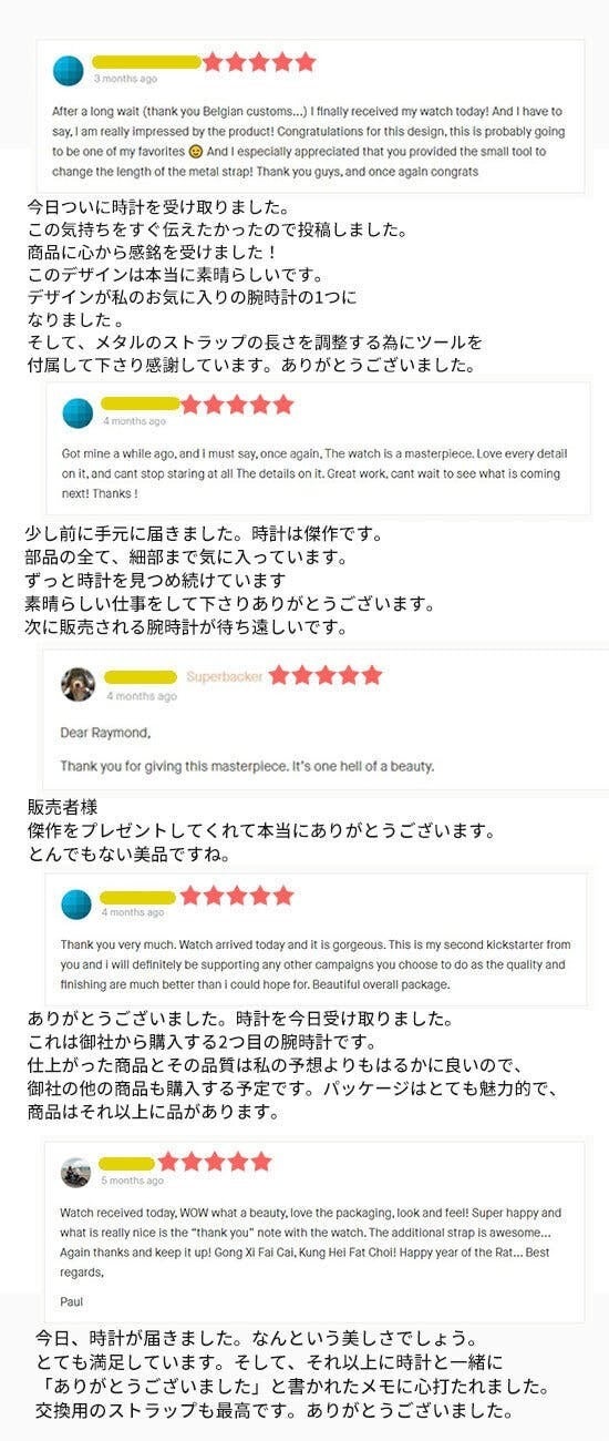 2021/08/02 11:19ご覧いただきありがとうございます。https://camp-fire.jp/projects/view/409192商品が届き、最終検査が終わりましたので本日・明日で商品を発送します。【クラウドファンディング購入者限定!】商品購入者の方限定で、公式ネットショップの購入いただいた時計の該当する型番のページ下部にある「レビューを書く」より評価を書いていただいたお客様【全員】に①保証期間を2年から2年半に延長②バリモアのブレスレットを無料プレゼントします!商品評価を書いた後で公式LINEより教えて下さい。宜しくお願いします。ネットショップ(購入していただいた時計をクリックして評価を書いて下さいね)https://valimor-japan.com/collections/valknut公式LINEhttps://bit.ly/2QnFdu1お届けまでもうしばらくお待ち下さい! もっと見る【ご住所の確認につきまして】商品を海外から発送しました!