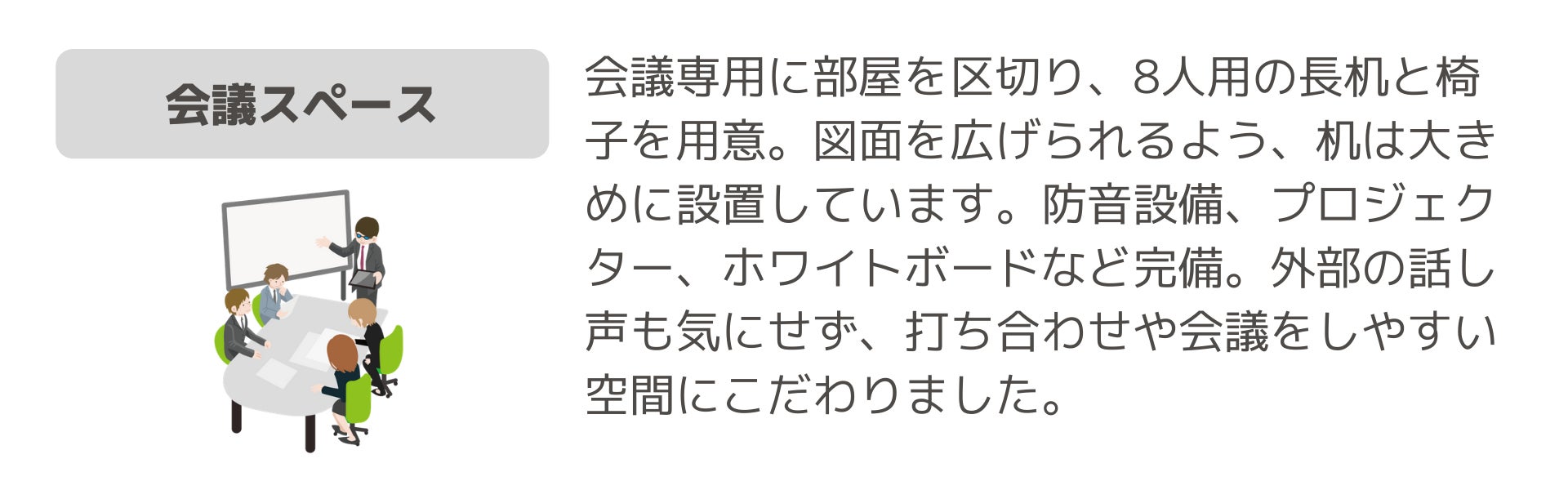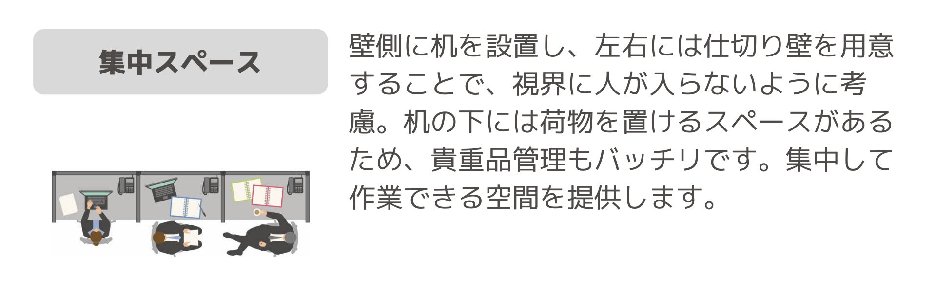 また、コワーキングを実際に利用する人の目線から、目的別に使える4つのスペースを用意。