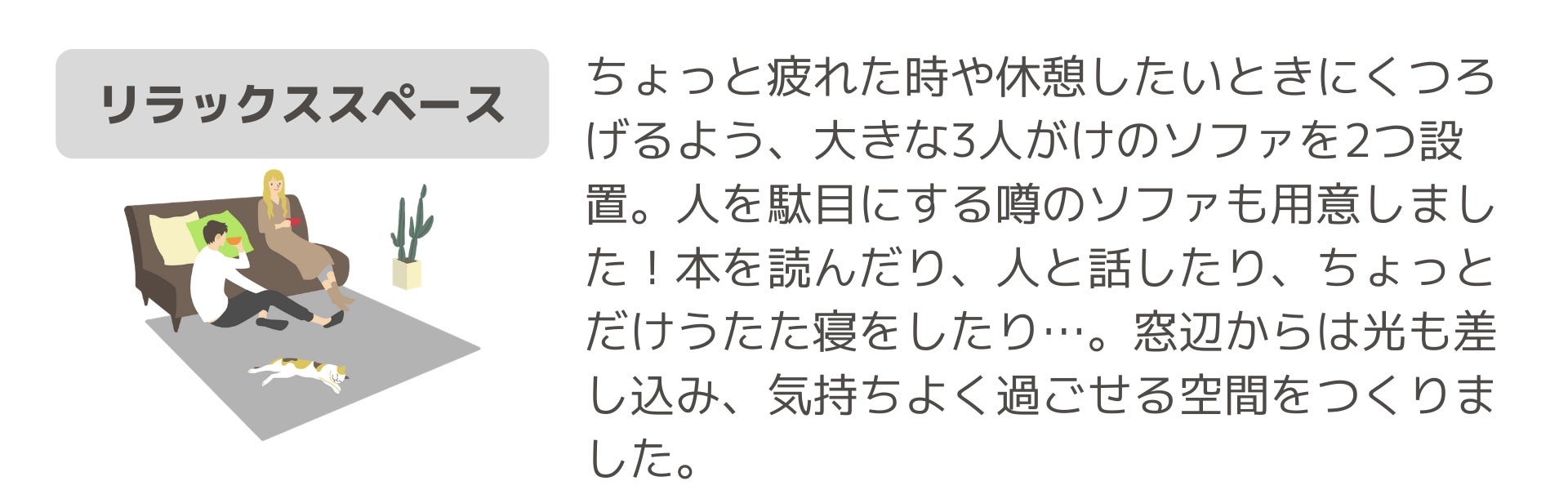 自分のその日の気分や仕事の進み具合で、自由にスペース利用ができるように工夫しました。