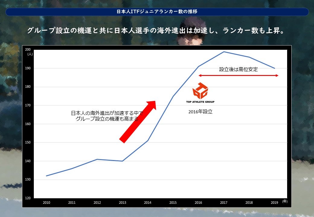 特に海外遠征においては、コーチ同士日程を合わせて互いの選手を預け合うことにより、ホームクラブをおざなりにすることなく十分な頻度の海外遠征を行うことができるようになりました。結果として、海外遠征に出るジュニア選手の数も飛躍的に増加。設立から4年後の2019年には、男女合わせて190人の日本人ジュニア世界ランカーが海外を舞台に戦うようになりました。