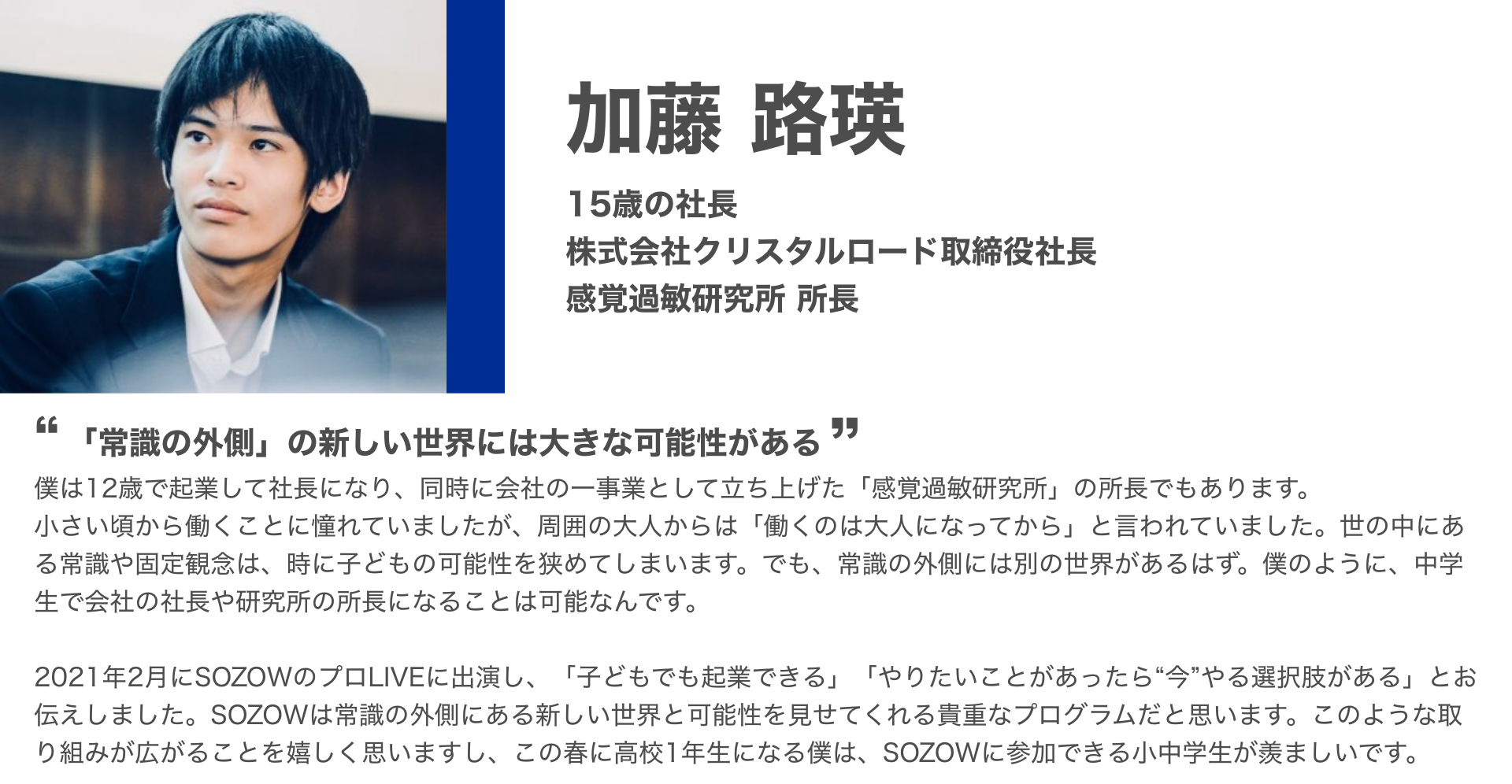2024/01/13 17:30前回、SOZOWが行ったクラウドファンディング「#好奇心解放宣言」では多大なご支援をいただき、誠にありがとうございました!いただいたご支援を活用し、この約3年間で私たちは子どもたちの好奇心と可能性を解き放つエデュテイメント(「学び=エデュケーション」×「エンターテイメント」の造語)のサービスをどんどん生み出しました。習いごとの「SOZOW PARK」に始まり、その後立ち上げた「SOZOWスクール小中等部」は不登校の小中学生が通うフリースクールの中では【日本最大規模】となりました。一方で、こんなお声をいただくようになりました。《SOZOWでやっと、僕/私の居場所ができた。でもこの先は?SOZOWが高校も作ってくれたらいいのに…》不登校の子どもが自信を持って社会に羽ばたけるようにするために、一刻も早く、中学校卒業後の進路の選択肢を作りたい。そして、誰もが希望をもって輝ける「好奇心解放社会」を実現したい。そこで私たちは、今年4月に「SOZOWスクール高等部」を開校することにいたしました!それは、誰もが安心できる環境で「学ぶ・遊ぶ・働く」を融合させ、社会で活きる力を身につけられる全く新しい学校です。構想から1年以内に学校をつくる、しかもスタートアップが…。私たちは今、試練の連続に立ち向かっています。皆様のご支援が必要です!ぜひ、「好奇心解放社会」を共に実現するために、この旗揚げの仲間になっていただけないでしょうか?https://camp-fire.jp/projects/view/730288もちろん、まずページを読んでもらえるだけで本当に有り難いです。読んだ上で「良いな」と思ってもらえたなら、どうかご支援・ご拡散いただけないでしょうか?いきなりの連絡で、不躾なお願いになって申し訳ありません。でも、それだけ本気でやっているんです!どうかよろしくお願いいたします。SOZOW株式会社代表取締役小助川 将 もっと見る