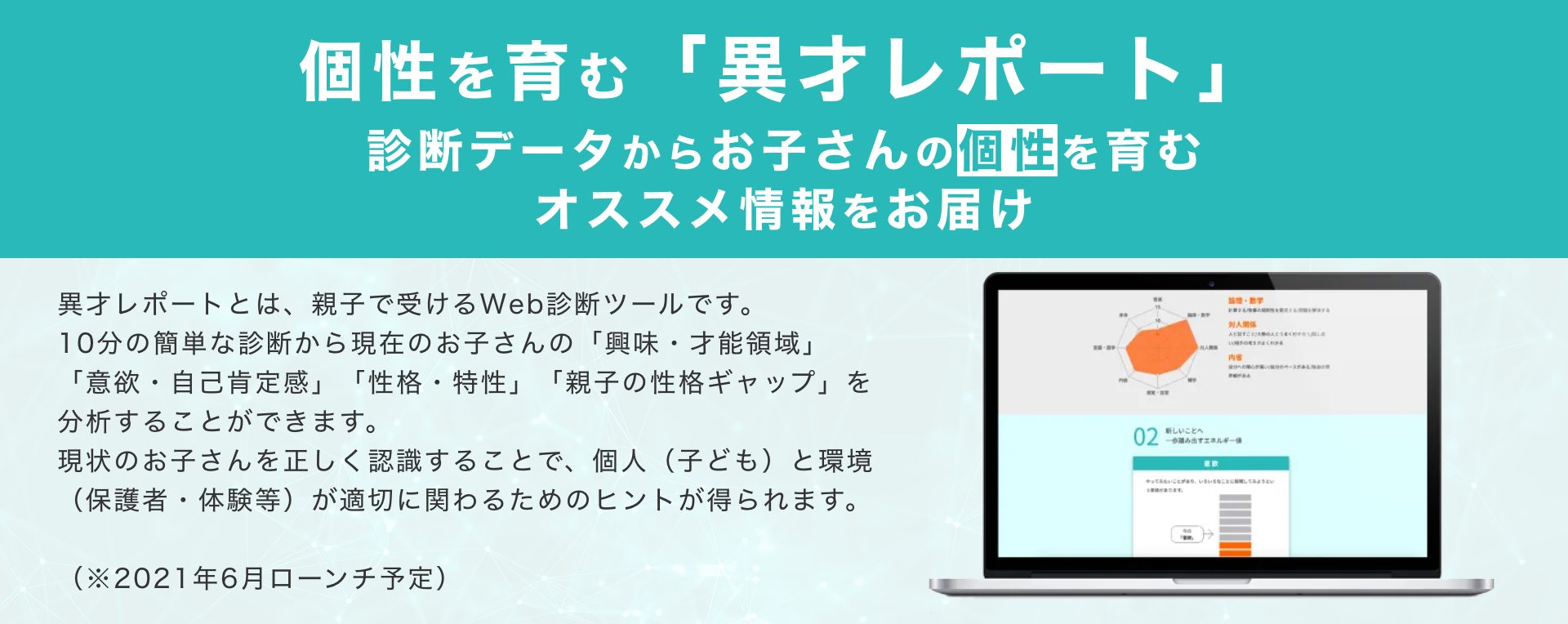 「SOZOW」に加え、お子さんの個性や親子の関係性を可視化するサービス「異才レポート(仮)」を開発します。