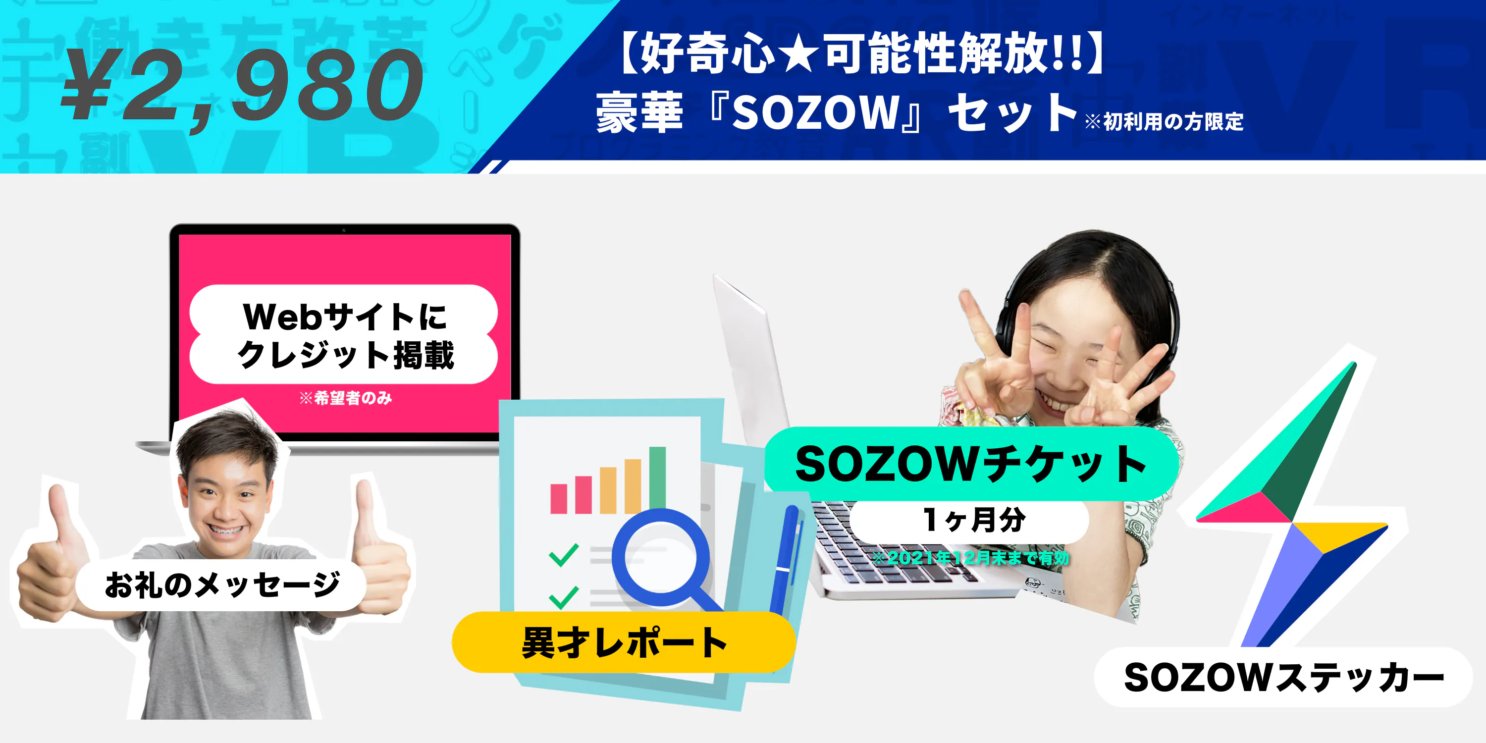 子どもの好奇心を解放し「想像力」と「創造力」を伸ばすオンラインの学び場『SOZOW』と、お子さんの個性や親子の関係性を可視化するサービス『異才レポート(仮)』の豪華セットです!この2つの組み合わせにより、親子関係を見直しつつ、お子さんの新たな可能性に気づくきっかけをご提供します。